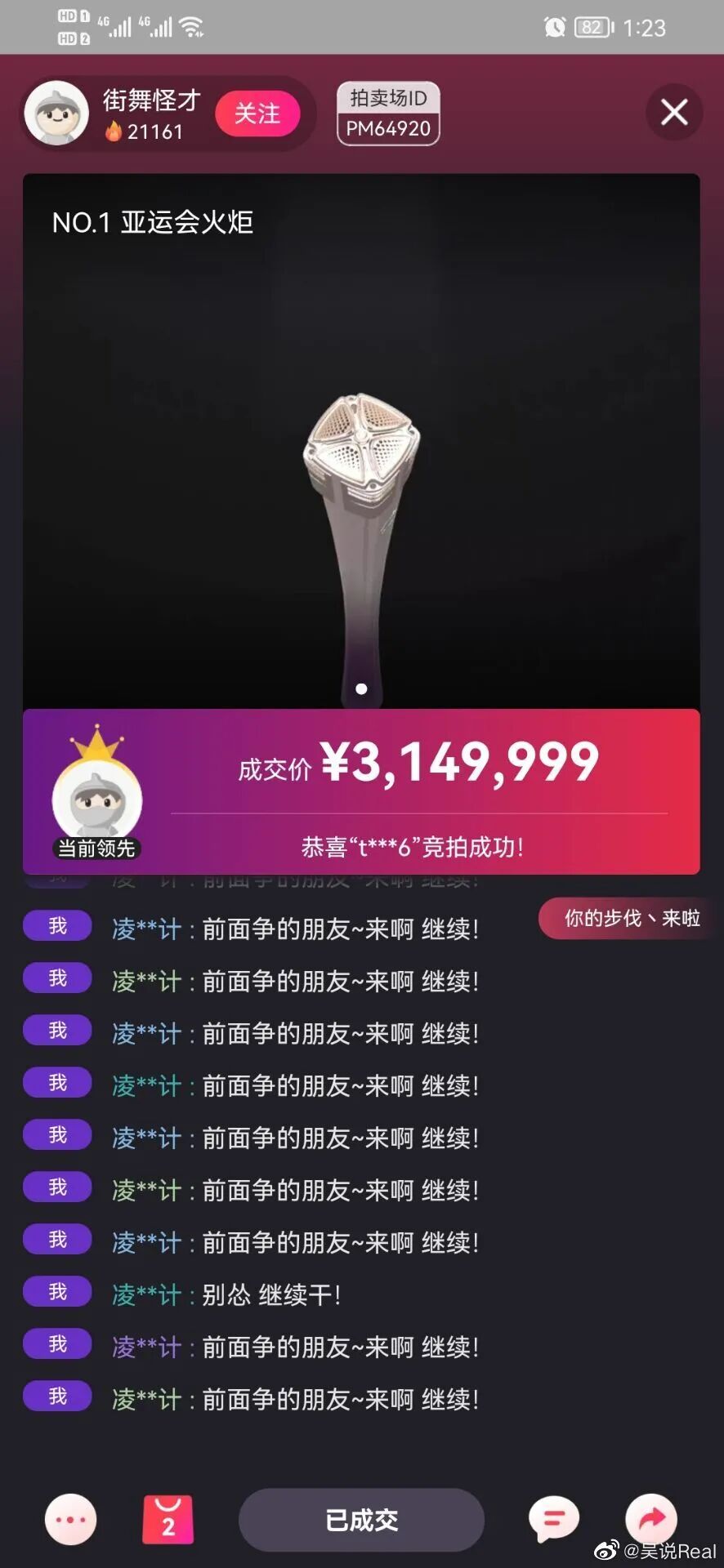 9月24日中午,名为“街舞怪才”的用户在淘宝阿里拍卖平台拍卖编号为NO.1的杭州亚运会数字火炬数字艺术品。有用户出价至大约315万人民币。