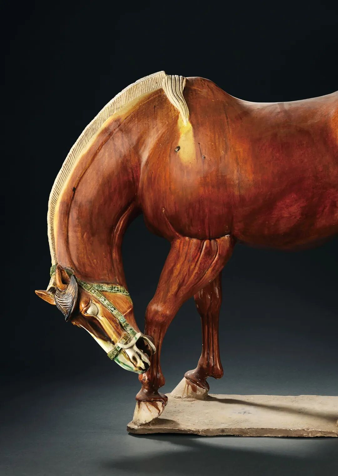 唐三彩造型中最常见的马俑和骆驼俑,在齐跃进的收藏中也是最多的,以至于他一时都想不起来要介绍哪一件才好。他收藏的马俑数量甚至比国有博物馆的总量都多。在齐跃进看来,唐代的马俑是中国历代做的最好的,对于马俑的优劣唐人也有一套明确的标准。“马的耳朵要像竹皮削出来一样,非常有骨感的。马的脖子要有力,前腿要长要直,提腕要高,后腿要像弓箭一样,马的屁股要圆。马尾巴也要经过精心修饰,一般我们称为飞机尾。具备这些特点,才能称之为好马,后世大多数马都不具备这些特点。欣赏马还是要看当中蕴含的内在的东西,有些马结构松散呈现出一种疲态,真正的好马一定蕴含着饱满的精气神儿。这当然只能意会。”
