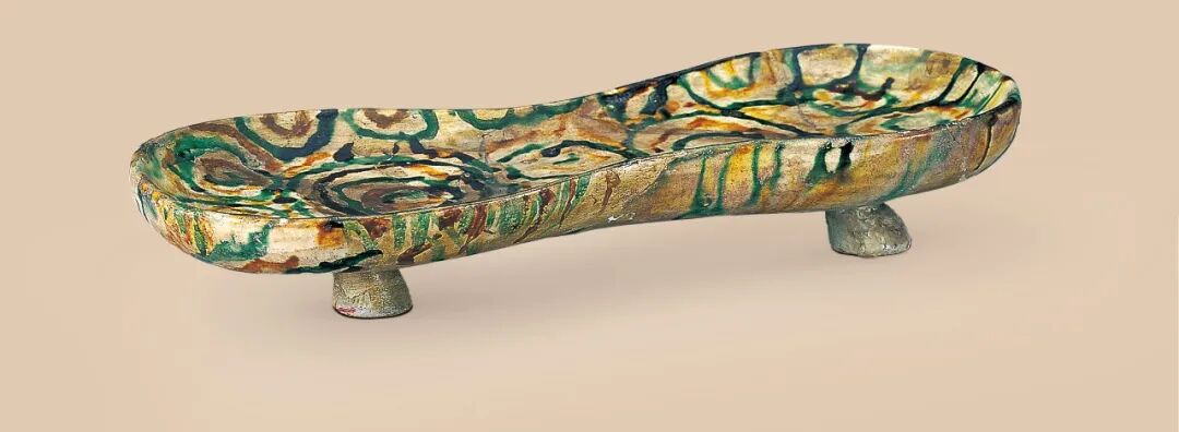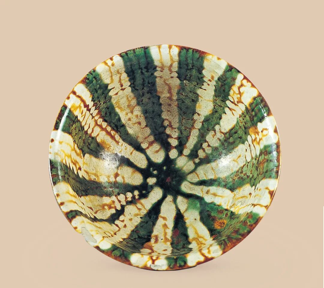 如果说三彩俑人带给我们的艺术感受是蓬勃的生命力,那么唐代三彩器物则向我们展示的是唐人生活中华丽的精美。三彩器具集中了唐代金银器、铜器、漆器等各种材质的器物造型,无论是碗盘碟杯还是瓶罐钵壶,造型上都规整有序。落落大方,小形器小巧精致,大形器饱满浑厚,有的还以金银器具等实用器为蓝本,吸入了中亚、西亚的工艺风格,带来浓郁的异域风情,充分体现出唐人追求完美,崇尚奢华,大胆创新的时代风格。李凤墓出土的唐三彩的早期作品三彩双联盘,造型别致,色彩鲜丽。胎体厚重。通体施淡黄色底釉,内壁和外壁上部绘绿、赭两色相问的套环形花纹。和盛唐时的三彩器比较,三彩的纹饰手绘痕迹明显,略显拘紧。釉色交融与流釉现象不明显,但整件器物配色大胆,艳而不俗,已然初显出唐三彩的艺术魅力,永泰公主墓出土的一件三彩折腹碗无论从工艺制作上,还是造型纹饰上都尽显出皇家用具的大气与精美。三彩碗轮制成形,造型规整精细,碗腹内外施乳白色底釉,器内有十二道绿色垂条纹间隔有赭色无序的细线纹,宛若阳光照射下碧绿湖面荡起的层层波纹,摇曳荡漾着无限的诗意,碗腹外壁以折棱为界釉色自然流淌出深浅不一,粗细不等的绿色条纹,恰似水中摇摆的株株水草,挑逗着欣赏它的目光。整件器物含蓄中流露出妩媚。精巧中凸显出沉稳,宛若它陪伴的那位早逝的皇家少女一般有着我们现今无法触及的神密的美(图9)。