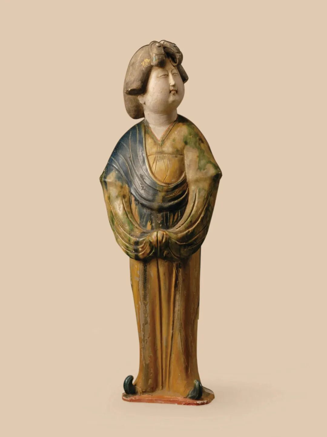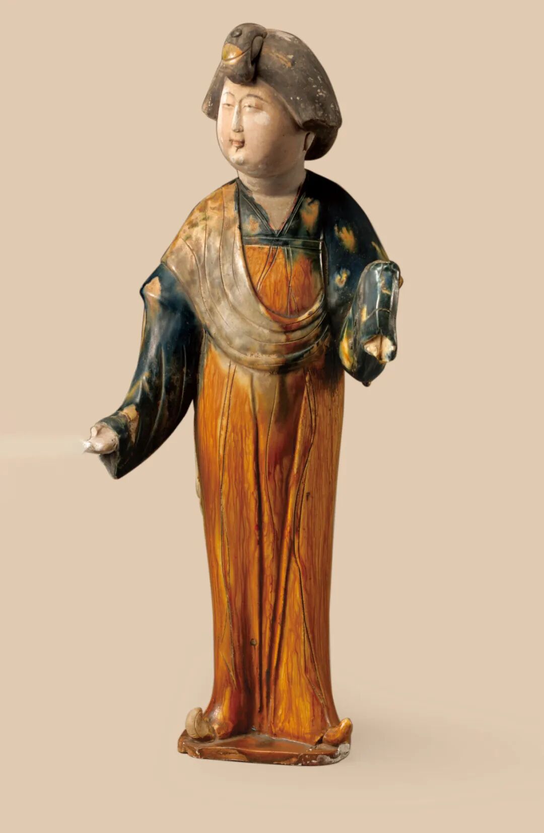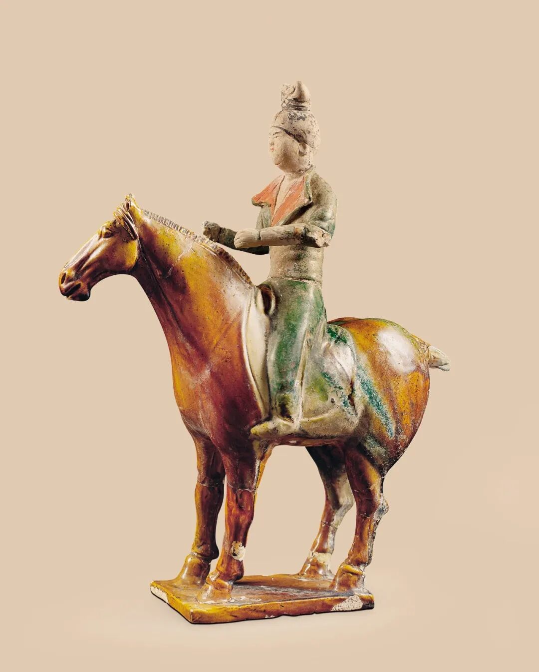 这批三彩女俑粉彩饰面,身施三彩釉,着V领窄袖襦,长裙迤地,露出上翘履尖,披帛搭肩,釉色以蓝、黄釉色为主 以点染、描绘等手法,表现出织物的印花特征,利用釉色的交融,变换出黄、蓝、绿、白的色彩效果,釉彩斑驳,洒脱率性,极好的呈现出衣纹的下垂感和流动性,使其具有丝绸般的光泽。(图3、4)1960年陕西省乾县永泰公主墓出土的一件三彩骑马女俑,头带胡帽,身着绿釉红翻领窄袖紧身胡服,足蹬小蛮靴,双手持缰状,坐于一匹褐红色骏马之上,人物身姿俊秀窈窕,身下的骏马膘肥体健,在人物与马匹的釉色处理上,与其他女俑多彩的釉色不同,此件中的马与人物基本以单色为主,简洁明快,却更加有效地烘托出着男装女子英姿勃勃的青春与活力(图5)。三彩俑的人物除了女俑外,还包括了官吏俑、武士俑、仆夫俑、乐俑、杂戏俑等,几乎包含了唐代社会各个阶层的人物形象,无论这些俑人所扮演的角色属于唐朝社会的哪一个阶层,制作者都倾注了饱满的创作热情,将每一个人物赋予了勃勃的艺术生命力,充分体现出大唐盛世人们的那种饱满的生活激情和乐观自信的精神面貌。