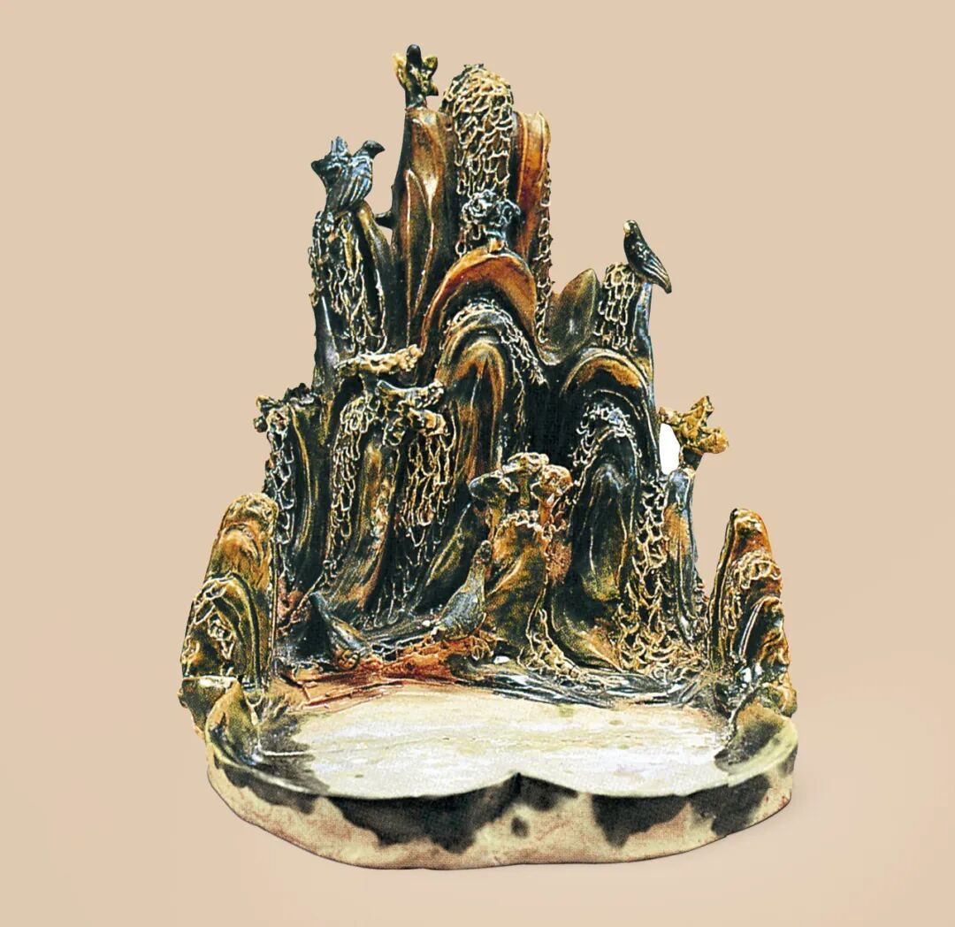 唐三彩的另一类器物就是居室建筑。1959年西安市中堡村唐墓出的一组三彩住宅模型完整地向我们展示了基主人生前豪华的宅第(图12),这组三彩院落为长方形两进院,前堂后寝构成建筑的主体,两侧廊房对称分布,中间布置有亭台山水,排列整齐有序。从正门进入,是一座四角攒尖亭,两側砌廊墙,并开有唐代流行的直棂窗,穿过小亭,来到堂房,堂房的屋顶与其它绿色的屋顶不同,为典雅的蓝色穿过堂屋便进入后院,跃入眼帘的是一座怪石堆砌的假山,假山山势险峻,层峦叠嶂,山腰间有数只鸟雀驻立在岩石之上,或振翅或顾盼,让人仿佛听到了清脆的鸟鸣之音。山角环绕一水塘,水塘边也有一双鸟儿,正低头饮水(图13)。整个作品充溝了自然的蓬勃生机。假山旁是一座八角凉亭,最里间为主人的寝屋。寝屋正身宽厚,四周砌有高台,错综参差的斗拱,曲线形的歇山顶,飞檐如翅,大红色门柱让整座屋室显得富丽堂皇。这组住宅是中国传统的建筑风格,整组建筑布局中规中矩,四方中正,前后左右讲究对称平衡。前庭后院的功能分布清晰明确,是唐代居民建筑的典型式样。