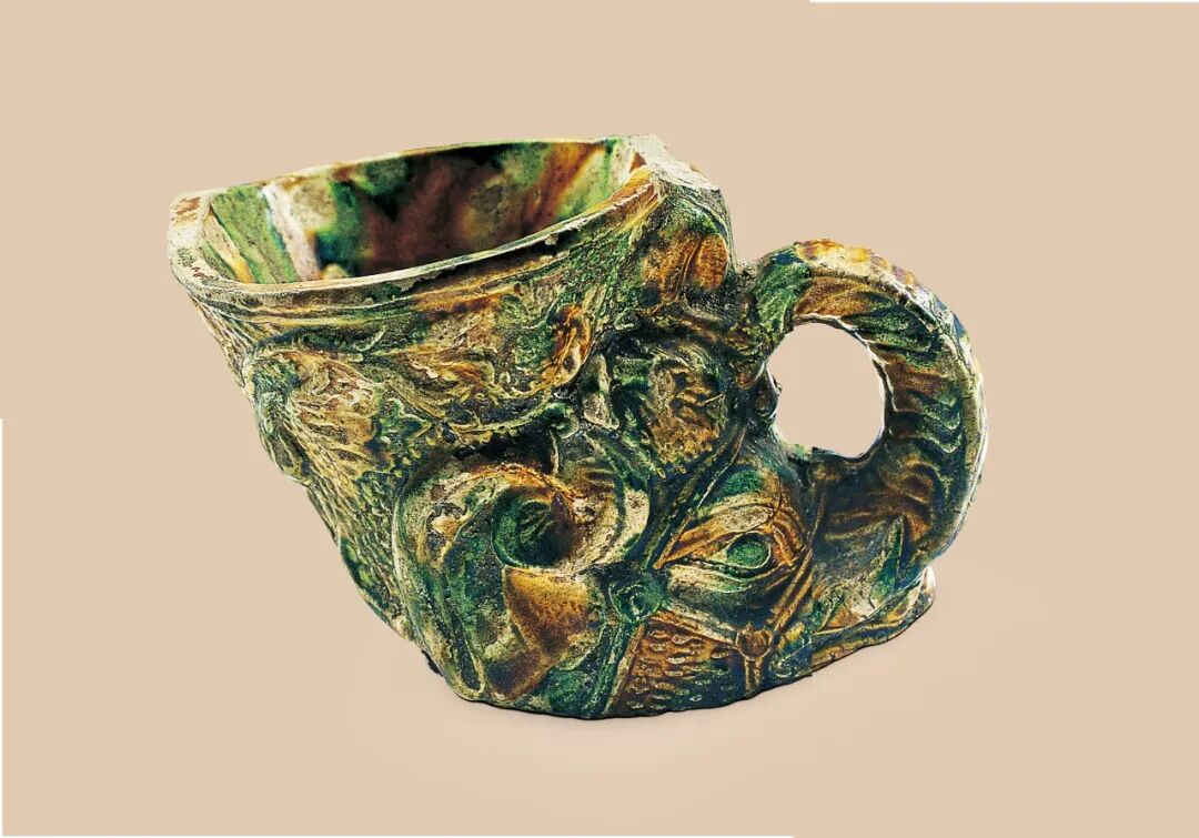 另外1957年西安南郊唐墓出的三彩象首杯也是値得我们驻足的件唐三彩(图10)。杯呈犀角形,外壁以浅浮雕雕出象首,象眼双睁,前端象鼻上翘形成环形杯把,象头上饰有缨络,釉色以深绿色和赭色为主,两种釉色斑驳交融,与充满立体感的象首相互辉映,烘托出一种狞厉而又神奇的艺术魅力。这件器物的造型与陕西历史博物馆收藏的出土于西安何家村的国宝级文物兽首玛瑙杯是同一类。它们的原形应是希腊的“来通”,“来通”一词是希腊的音译,有流出的意思,应为饮器。从以往的唐代图像资料看,这类饮器多出现在胡人的宴饮生活之中。而这种带有鲜明异域风格的器物,也成为唐代中外物质文化交流的实证。三彩器中最能体现三彩釉色之美的应当属三彩罐无疑。这类器物大都器型饱满浑圆,稳健大气,釉色多姿多彩,缤纷绚烂。1956年西安市三桥镇唐墓出土了一件三彩罐完美地体现了这一类器物的特点。这件三彩罐器型规整,釉色以赭色、绿色、白色为主,三色釉相互浑散浸润,交融流淌,宛若天边的彩虹散发着梦幻般的色彩(图11)。