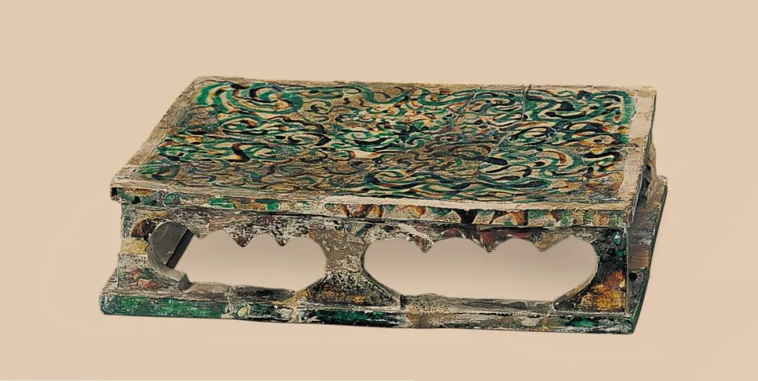 唐三彩是在汉代及南北朝时期的单色和双色低温铅釉陶器的基础上发展起来的,就现有的考古资料显示,三彩器物始于唐高宗时期,最早的三彩器物是麟德元年(664年)郑仁泰墓出土的一件蓝彩残器盖1,此外陕西历史博物馆收藏的唐高祖献陵陪葬墓李凤墓出土的三彩双联盘(图1)和三彩榻(图2)则为时代较早的完整三彩器。而三彩俑的出现要晚于三彩器物的出现,1995年陕西省考古研究所在陕西省高陵县马家湾村发掘的唐武则天载初元年(689年)秋官尚书李晦墓出土的三彩俑是目前所知有明确纪年三彩俑中最早的一批。三彩器的集中出土地为洛阳和西安一带,这两地是唐代的政治经济文化中心。根据1990-1991年陕西省考古研究所的统计,陕西省铜川市黄堡镇耀窑窑址处遗存有三座唐三彩的古窑址以及一处非常完整的三彩作坊,还出土了三彩制品4226件(片),据专家推断,维持这样一个工场的运行至少需要匠人30人,规模在当时已是相当的大,此外在1998年至1999年,西安原西郊机场(唐长安城醴泉坊旧地)发现了百余块陶器,三彩残片和窑具,其陶器多为素烧后淘汰丢的三彩胎。一块陶片上还刻有“天宝四载……祖明”字样,据发表的形象资料显示,这里发现的俑马类三彩器西安一带唐代大墓里的出土文物形象很接近,故发现者认为它就是甄官署造作三彩的作坊2。而河南的三彩窑址在巩义的大、小黄冶村附近,遗址面积也是相当大,仅窑炉就有十余处。这些窑址的发现对西安、洛阳地区唐三彩的大量出土提供了有力的依据。