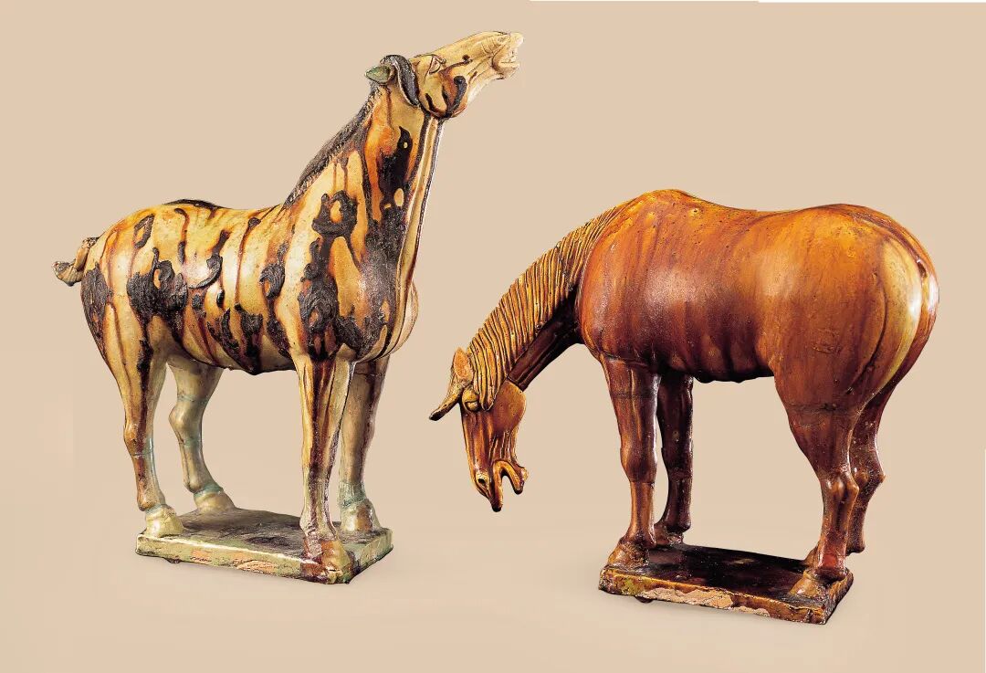 唐三彩中另一类夺人眼球的俑便是三彩马。仰头马和低头马出自1960年乾县永泰公主墓(图6)。两匹马各具特色,精彩异常。仰头马通体浅黄釉,间施以深褐色釉斑,并有流釉产生的淡褐色线条,此马双目圆睁,眉骨高耸,健齿毕露,昂首嘶鸣,马身釉彩大胆恣意,炫烂夺目,具有极强的视觉冲击力:低头马全身施以褐红色彩釉,釉色在烧制过程中呈现出无序的浅黄色斑块,淡黄色鬃毛极整齐地披在马颈的左侧,四肢强健,臀部浑圆,低头引颈做觅食状。制作者准确地抓住了马匹在现实生活中鲜活的动态瞬间,赋予了两匹三彩马丰富的情感内涵,形态上一静一动,色彩上一花一素,交相辉映,不禁让人联想到杜甫,《题韦偃画马歌》里的诗句:“一匹龁草一匹嘶,坐看千里当霜蹄”,而那匹仰头马则是杜甫另一首《秦州杂诗》中所描写的战马:“哀鸣思战斗,迥立向苍苍”最真实的写照。