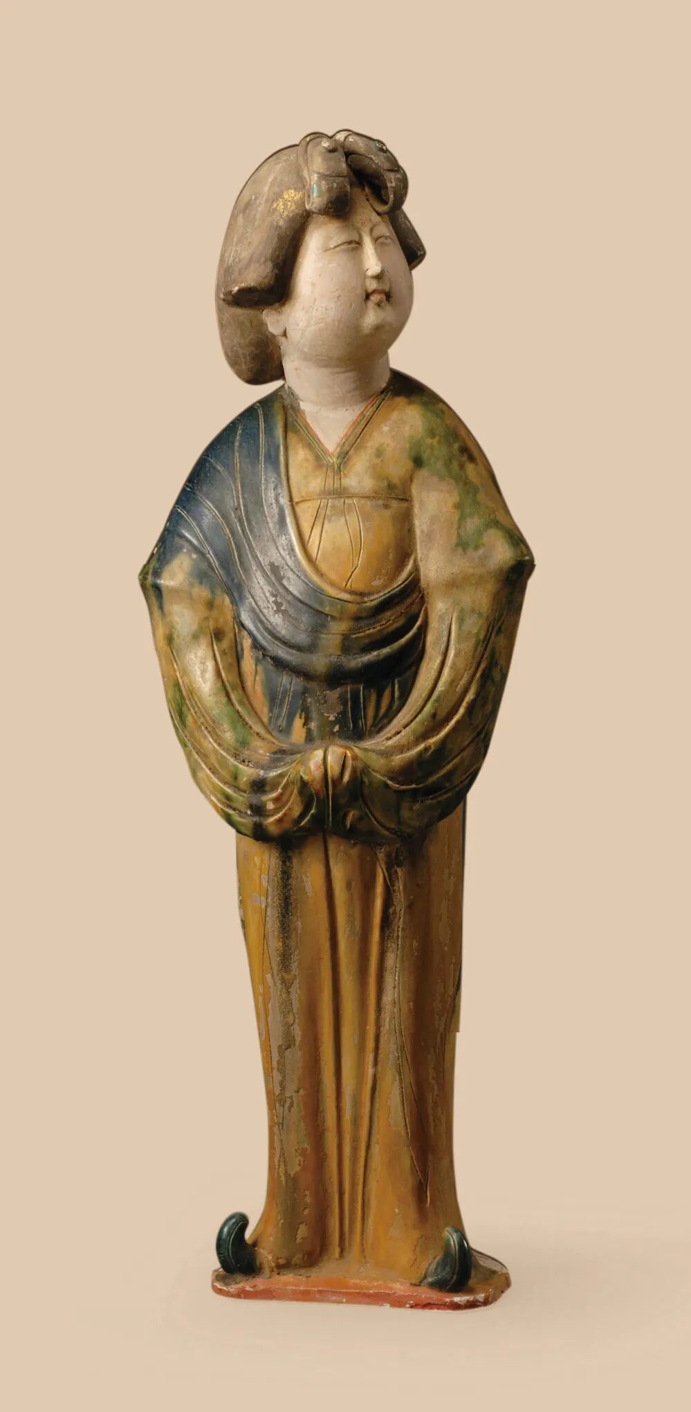 三彩器中的人俑与动物俑最能体现盛唐时代所孕育的勃勃生命激情。唐代工匠们在艺术实践中积累了丰富的创作经验,在塑造中注重把握艺术形象的神态并力求由此传达出不同的情绪和情感。这一时期的三彩人物俑体态丰腴健硕,人物塑造栩栩如生,充满了生命的活力和丰富的精神魅力,这其中三彩女俑的形象最为饱满和多姿。1959年陕西省西安市西郊中堡村出土的一批唐三彩,其中的女立俑,姿容甜美丰腴,仪态娴雅华贵,眼神顾盼之间流露出对生活的欢悦和满足,这种毫不掩饰的华丽而阳光的女性气质,是盛唐女子的共有气质,是大唐统治者以纵容的心态将女性之美推向极致的结果。