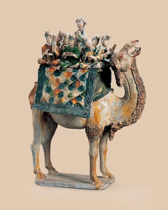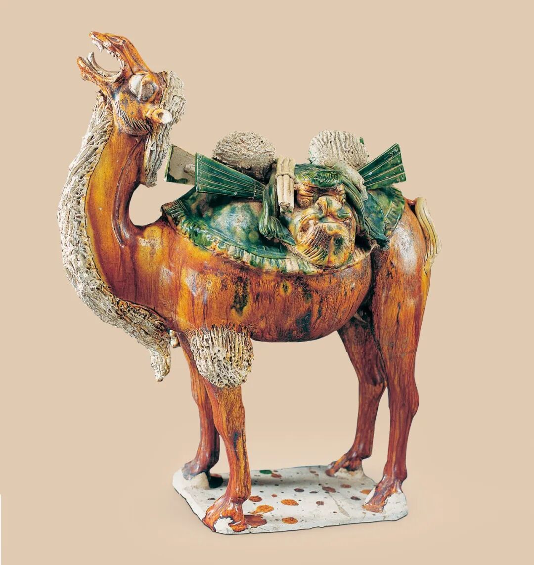 另一个需要提的动物俑就是三彩骆驼,骆驼做为唐代丝绸之路贸易往来的主要承载工具,它的形象在唐代三彩明器中不仅数量较多,造型也是多姿多样,或静立,或行走,或匍卧,或负重欲起。它成为丝绸古路上唐代中西贸易、文化交流的使者和见证者。1959年西安市中堡村出土的二件三彩驼骆,可以说是这里面的精品。一件为载乐骆驼俑,白色驼身,仅在颈部、唇、眼以及四肢和尾部的驼毛处涂染成褐红色,驼颈高仰,似仰天长鸣,驼峰处垫有椭圆形毡子,上支有架案,架案上铺菱形图案的织毯,用赭黄、蓝、白等釉色点染出织毯图案和纹理,织毯上坐七位手捧各种乐器的男乐俑和一位站立的女歌伎俑,每一个人物的服装色彩均不相同,表情和姿态也各有差异制作者以夸张的艺术手法,将八位乐舞俑一起放置于强健的驼背之上,乐舞人俑悠然自得的神态和骆驼充满力度的粗放野性相互烘托。使整个作品带有浓郁的浪漫主义色彩,让我们仿佛听到了缭绕交织在丝路古道之上优美绵长的胡乐、胡歌和高亢的驼鸣之声(图7)。