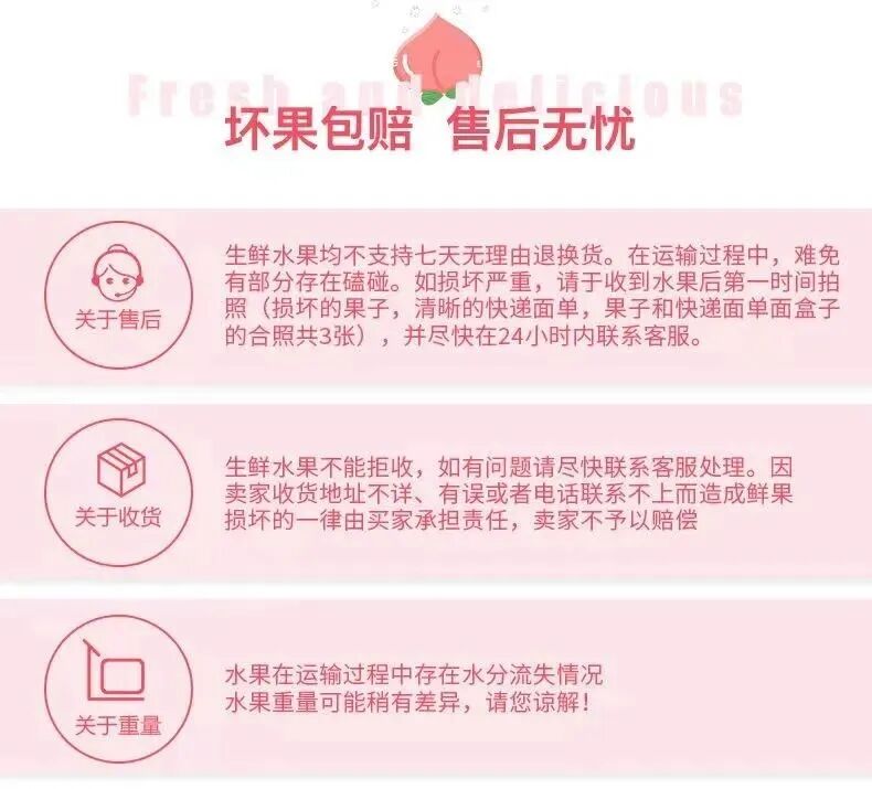 为了保障水蜜桃的口感。果农们会根据收货地的远近,发7-8分熟度的桃子。所以刚到手的蜜桃可能会偏硬,这时口感脆爽多汁、酸酸甜甜,吃起来会有“咔嚓咔嚓”的声音耳边萦绕。大家可根据个人喜好食用桃子,喜欢吃软桃的话可以多放几天。