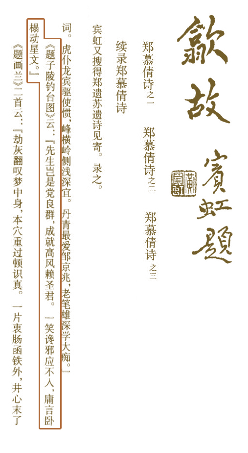 《续录郑慕倩诗》 :宾虹又搜得郑遗苏诗见寄,录之。有《余霞散成绮篇》云… 又《寻先师山公钓台》云… 又《题子陵钓台图》云