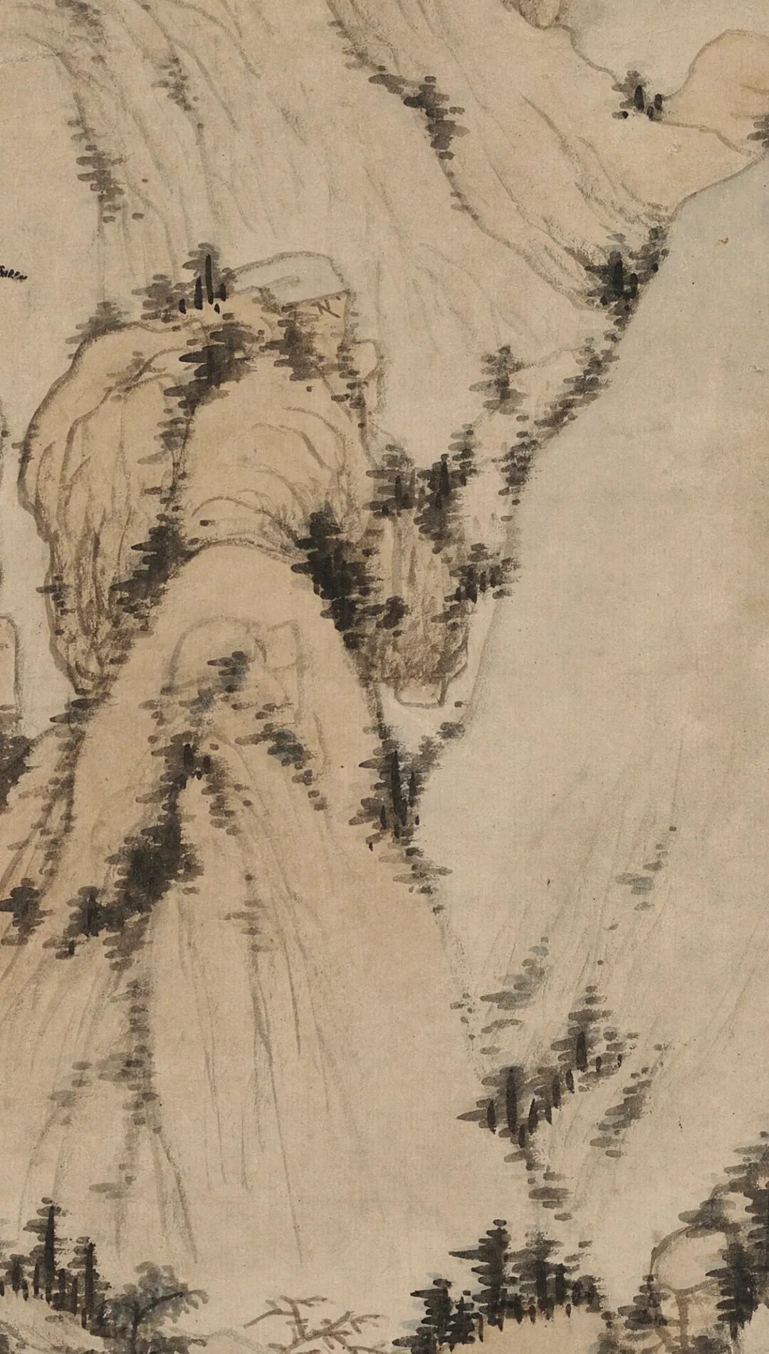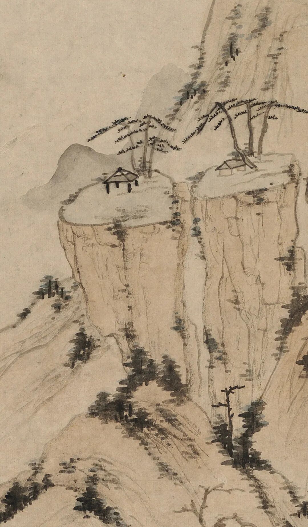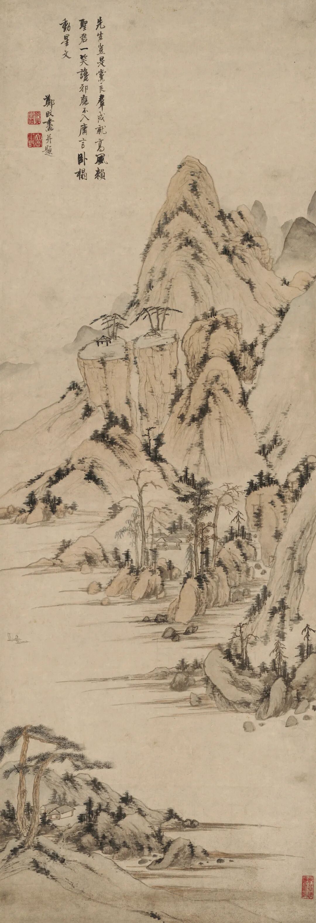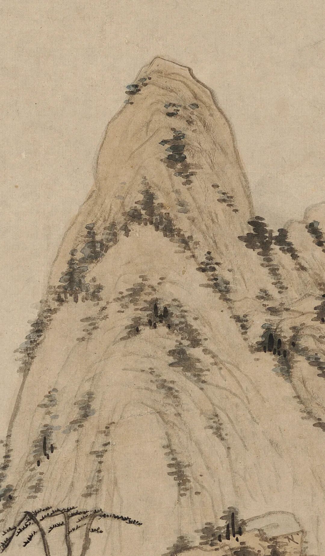 借 题 本幅这种峭立高耸的山峰不见于富春江流域,却与郑旼图绘的黄山十分形似。虽沿袭了新安画派常见的一河两岸三段式构图,但作狭长式布局和高远透视法,中景处的山峦自溪岸结组绵延而上,与远景处巍然耸立的主峰连成一脉。