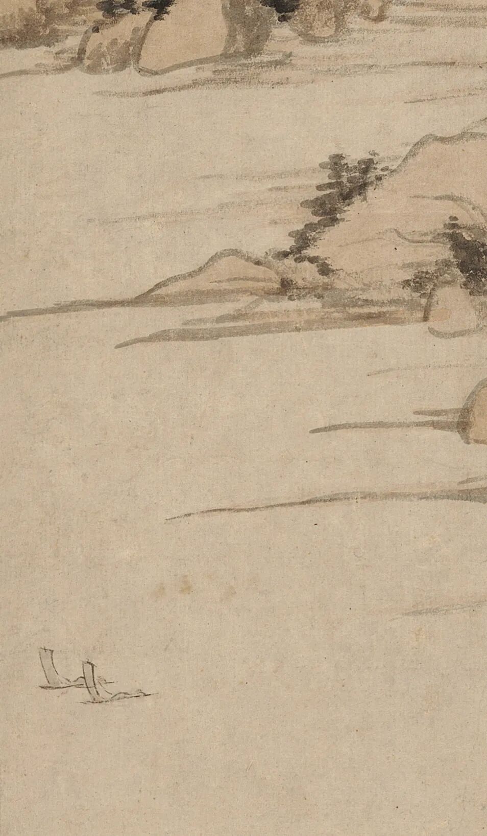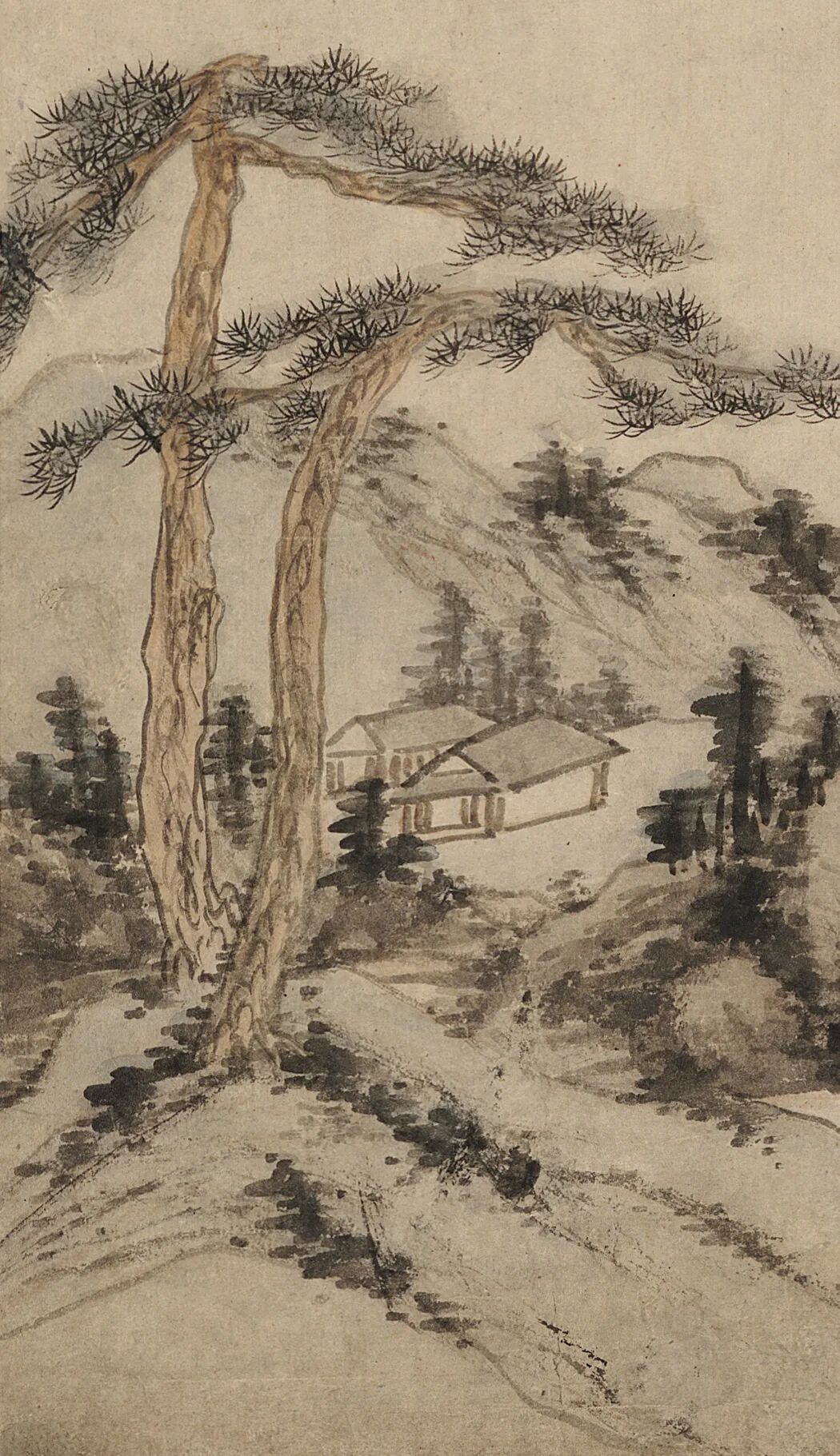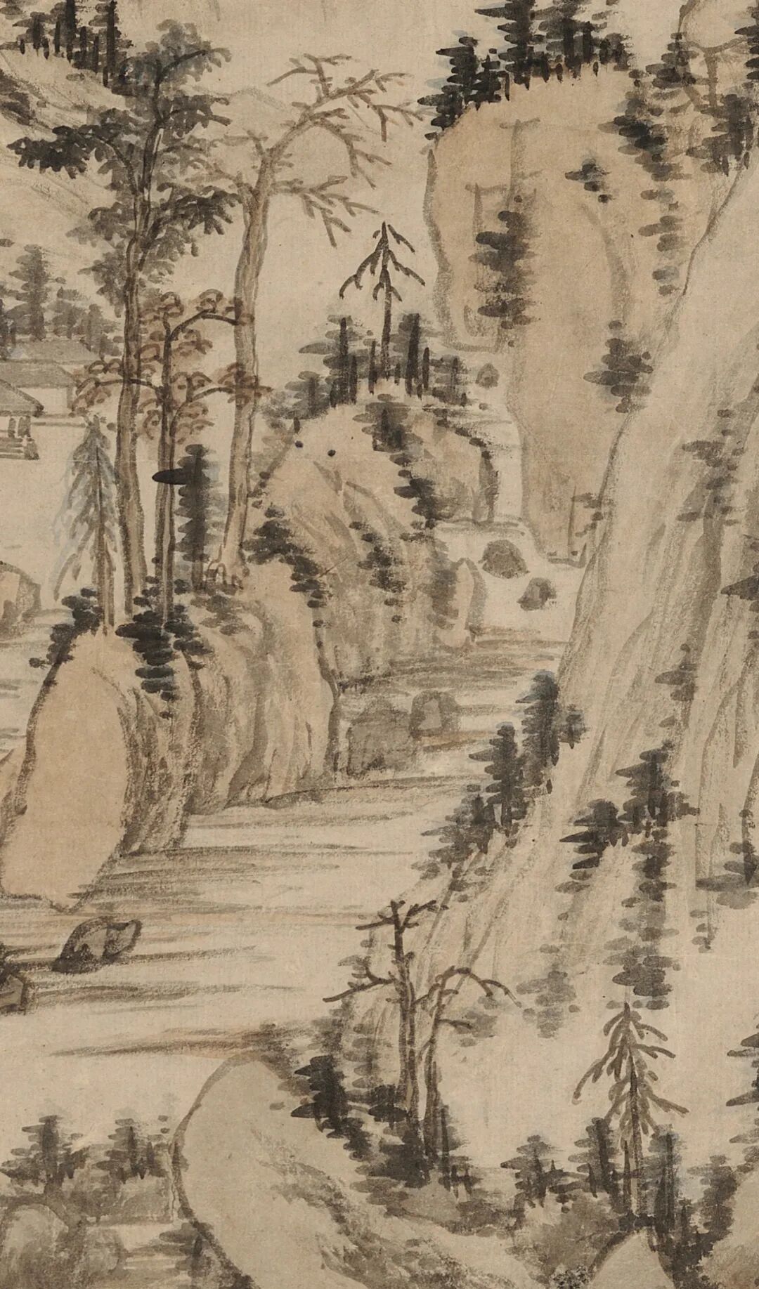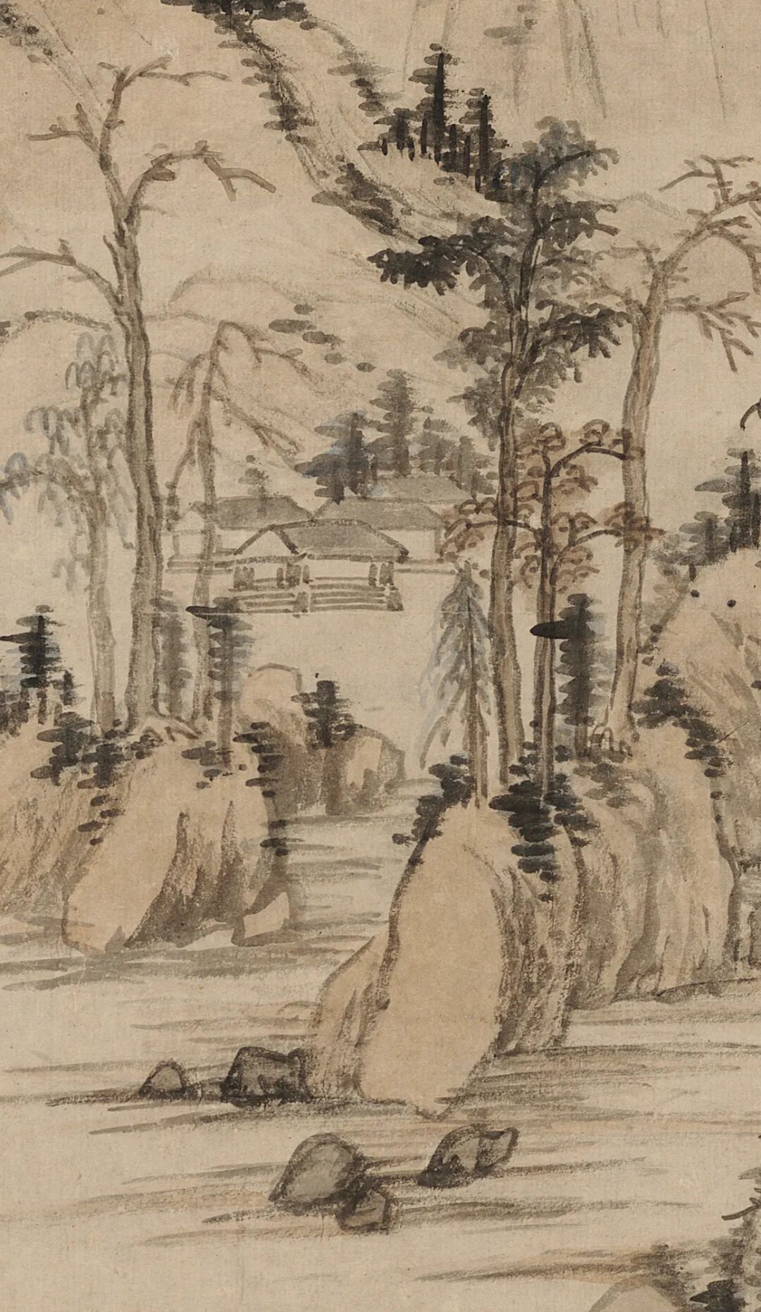 借 题 本幅这种峭立高耸的山峰不见于富春江流域,却与郑旼图绘的黄山十分形似。虽沿袭了新安画派常见的一河两岸三段式构图,但作狭长式布局和高远透视法,中景处的山峦自溪岸结组绵延而上,与远景处巍然耸立的主峰连成一脉。
