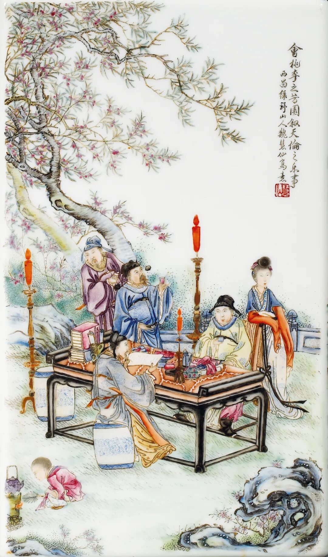民国 ·潘匋宇、魏荣生、汪大沧 绘粉彩人物花鸟图四方琮式瓶识文:1.会桃李之芳园,叙天伦之乐事。西昌绿野山人魏慧仙写意。钤印:慧仙