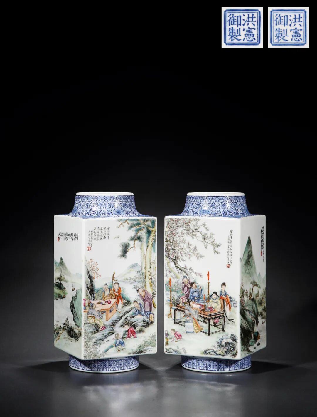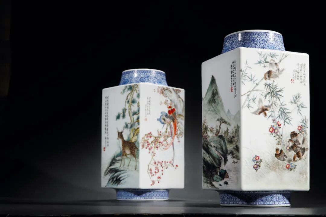 此对四方琮式瓶体型硕大,造型古朴,集民国名流合力之作:通体施白釉,釉色洁白闪青,胎质洁白坚实,颈部与圈足饰以花纹一周。魏荣生绘松下高士图,设色高雅,塑造形象具古拙之韵味;又做作牡丹花猫,牡丹花开富贵,花猫憨态可掬,娇俏可人,手法细腻,别致动人;汪大沧作江边山水,老松茂盛,远山萧索,江中帆影依稀;潘匋宇作枝上雀鸟,枝叶残秀,鸟雀顾盼,妩媚娟秀,寓意祥和。纵观此器,充分体现了民国“以诗入画,以画孕诗,诗画结合,相互唱酬”的艺术时代风貌,不失为一件值得收藏的民国佳品。