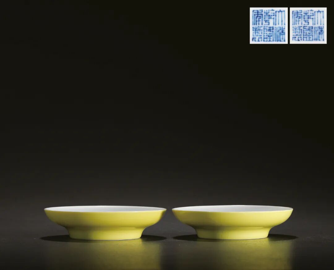 本品为乾隆早期御窑延续前朝之作,胎薄体轻,盘壁折腰,曲线婀娜。《陶成纪事碑记》中名为“西洋黄色器皿”,是清代单色釉中的名贵品种。把玩之间,亮丽可人。