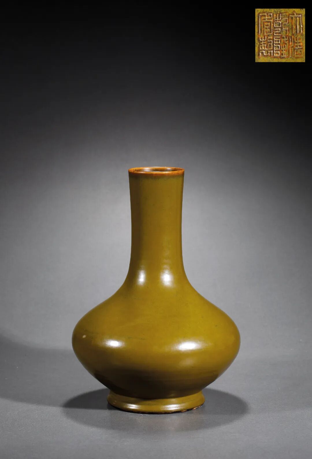 唐英《陶成纪事碑》记载厂官釉品种有三:蛇皮绿、鳝鱼黄、黄斑点。后人习称鳝鱼青、鳝鱼黄、茶叶末。本品直颈,扁腹下垂,圈足外撇,为清代的经典瓶式。