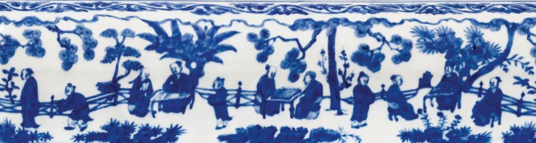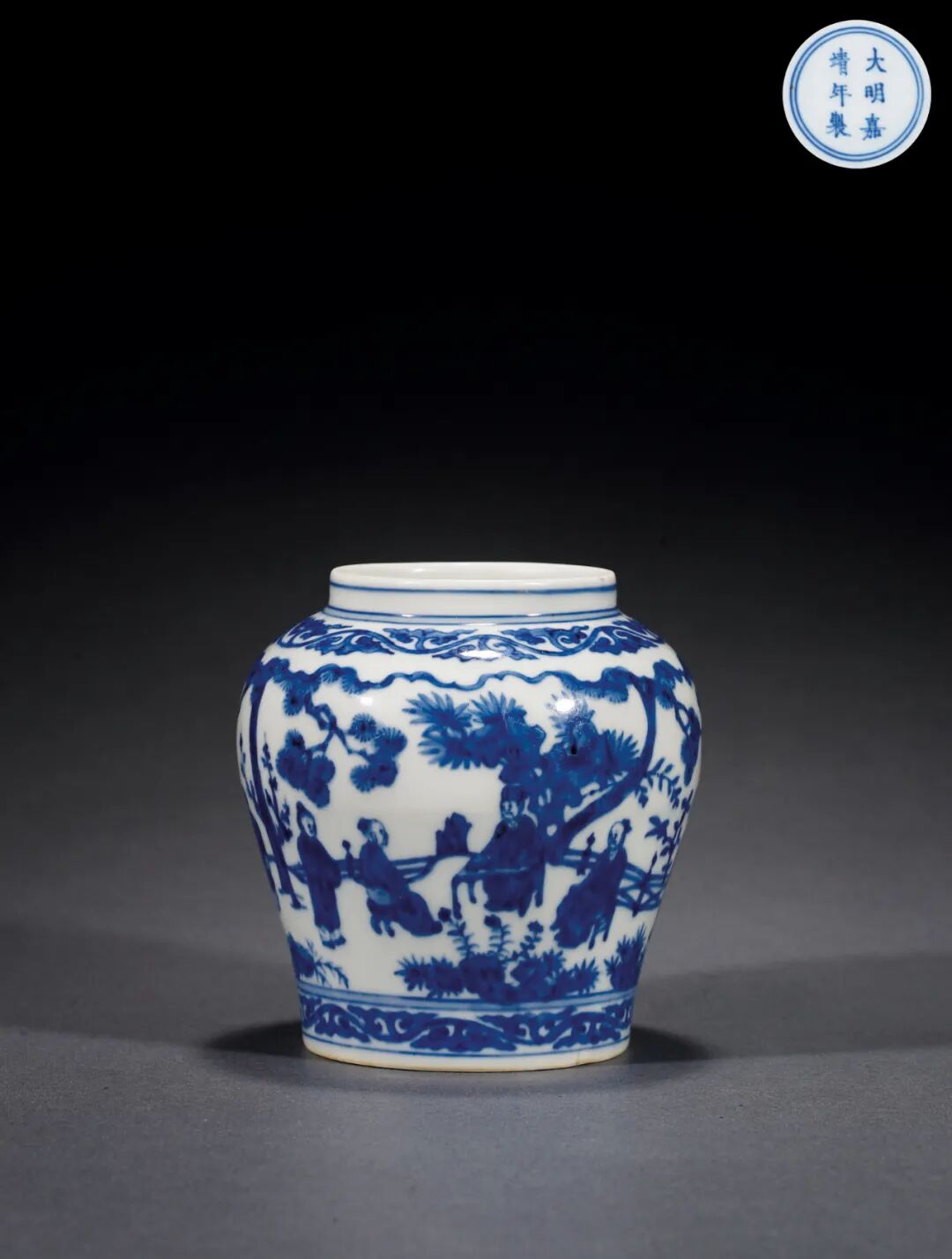 出版:《EXHIBITION OF CHINESE ARTS》,卢芹斋,1941年,第657件。此罐画工精细,青花发色浓艳,完美呈现嘉靖回青料的幽蓝之美。与香港赵从衍氏旧藏青花罐品种相同,器形小巧,小罐腹部绘高士听琴、弈棋、读书、作画场景,其中听琴画面,与宋徽宗《听琴图》场景颇为相似。