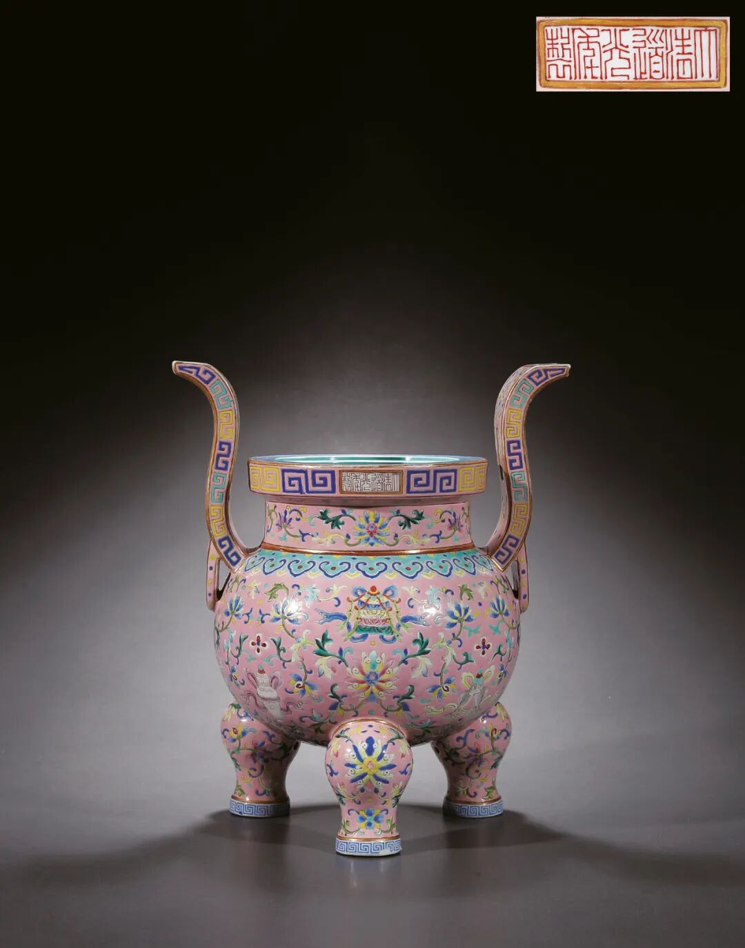 清宫御瓷运用象首为耳,为乾隆朝首创。乾隆十三年之前,此式象耳瓶已经被烧造,象耳尊作为乾隆朝创新之品,应该烧造于乾隆六年之后,本品为最早器皿之一。