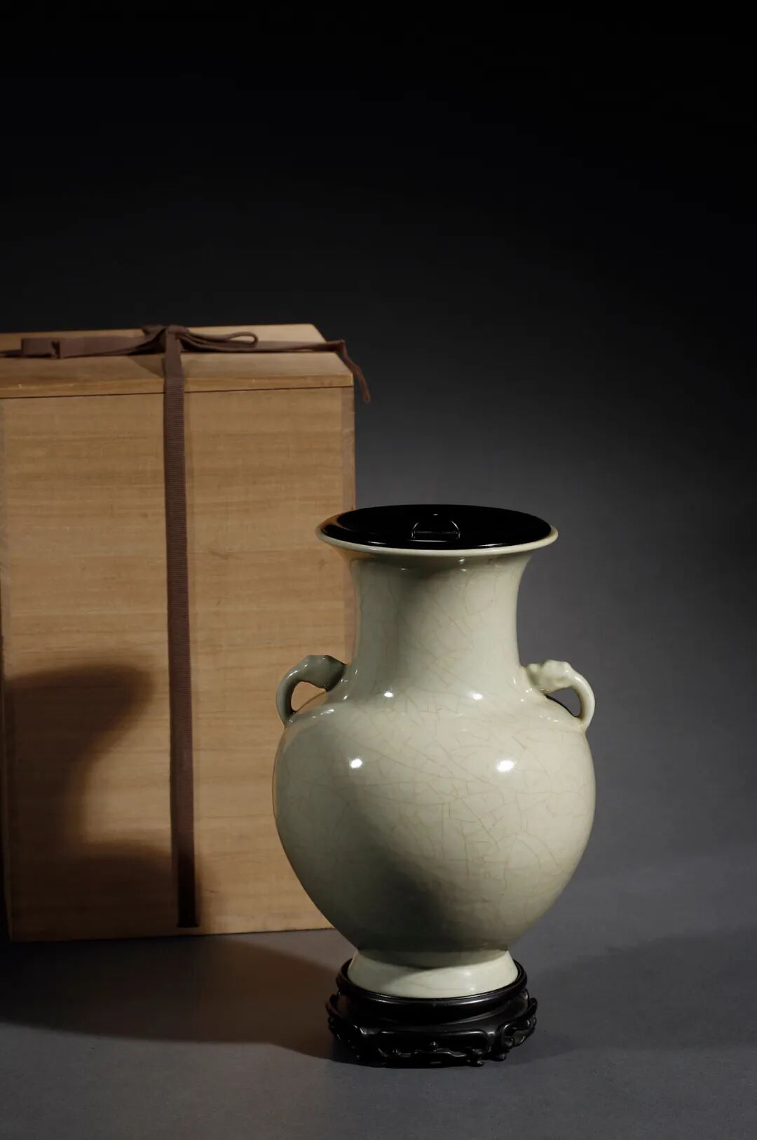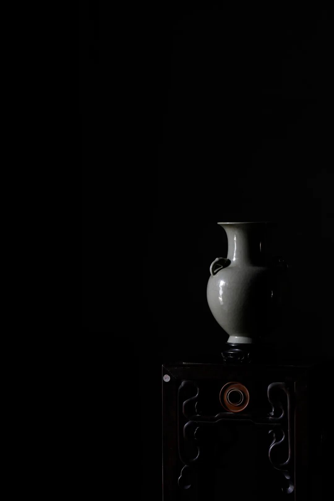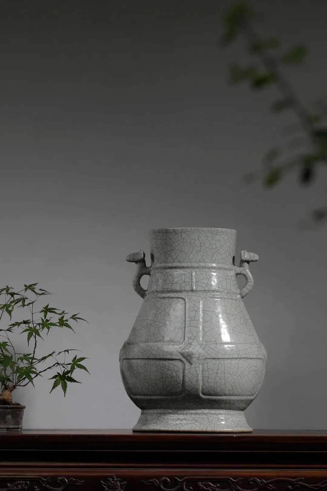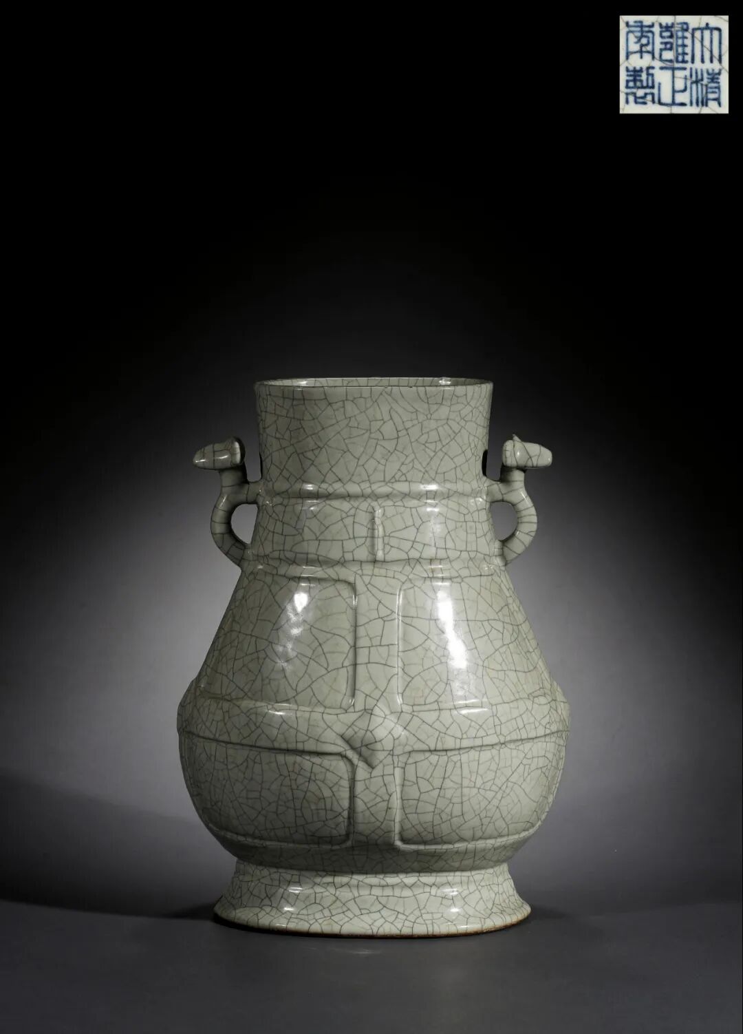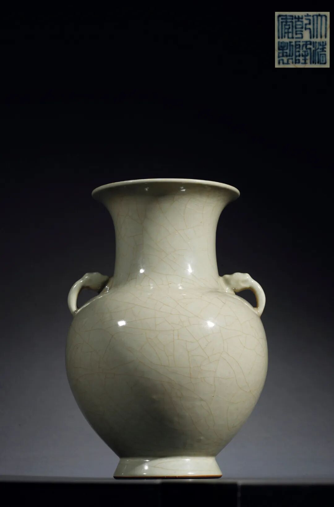其中卢芹斋旧藏的明嘉靖· 青花四艺图小罐,器形小巧隽美,完美呈现嘉靖回青料的幽蓝之美,画面与宋徽宗《听琴图》场景颇为相似。还有唐英“仿古”创烧的雍正仿官釉双龙耳汉壶尊,乾隆仿官釉象鼻耳敞口尊、乾隆青花三多纹蒜头瓶均是清代帝王慕古情愫的倾注:品鉴内府丰富之典藏,令重臣对照临摹,以求胎釉、气韵一致。
