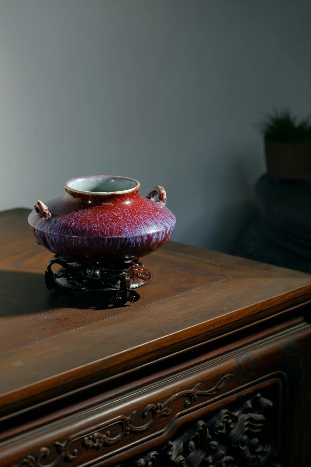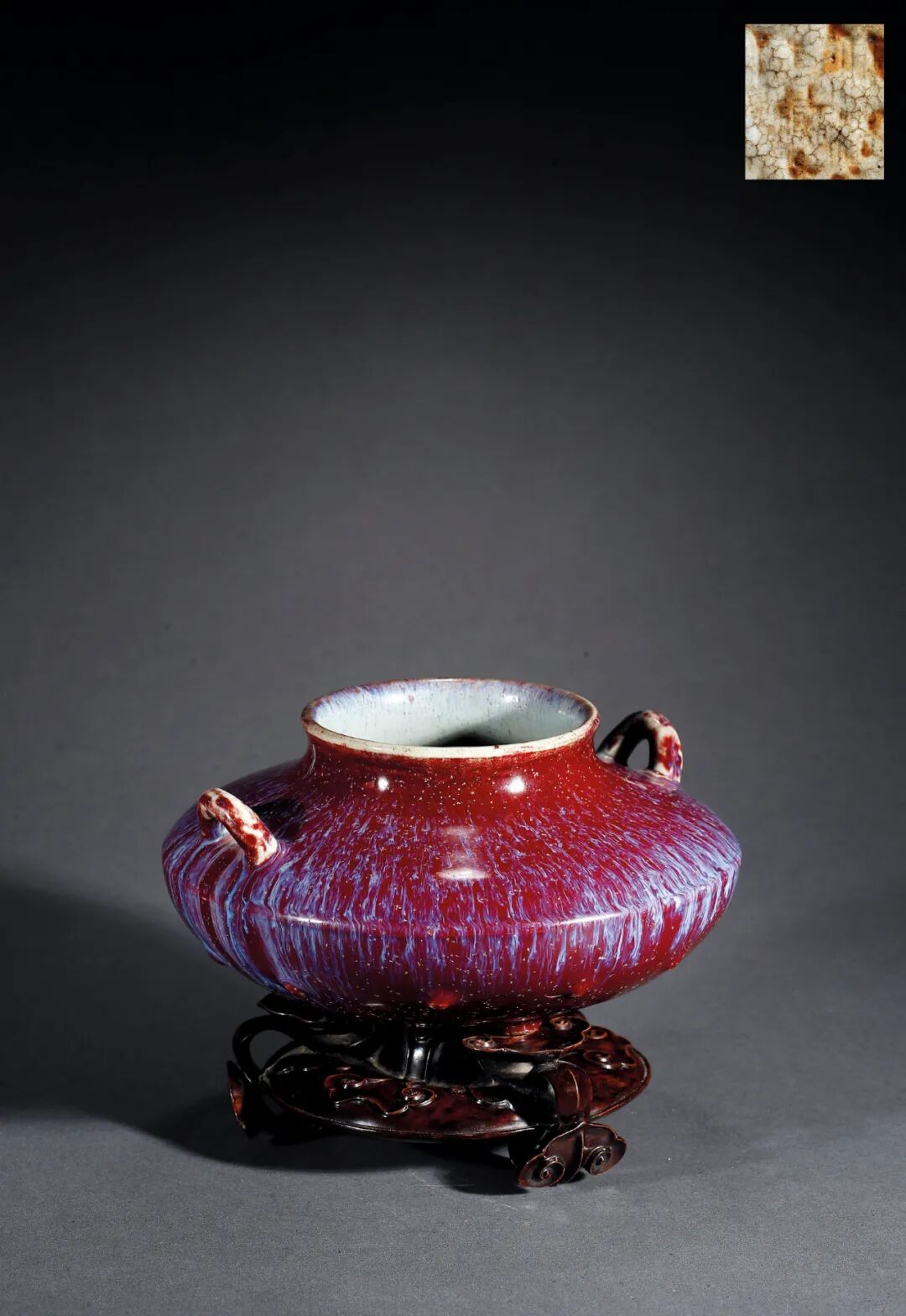 本品唇口短颈,溜肩扁腹,两侧贴塑双系形耳,下承三足,整体造型敦实可人,胎体厚重,通体施窑变釉,紫红斑相交辉映,为窑变釉中之上品。