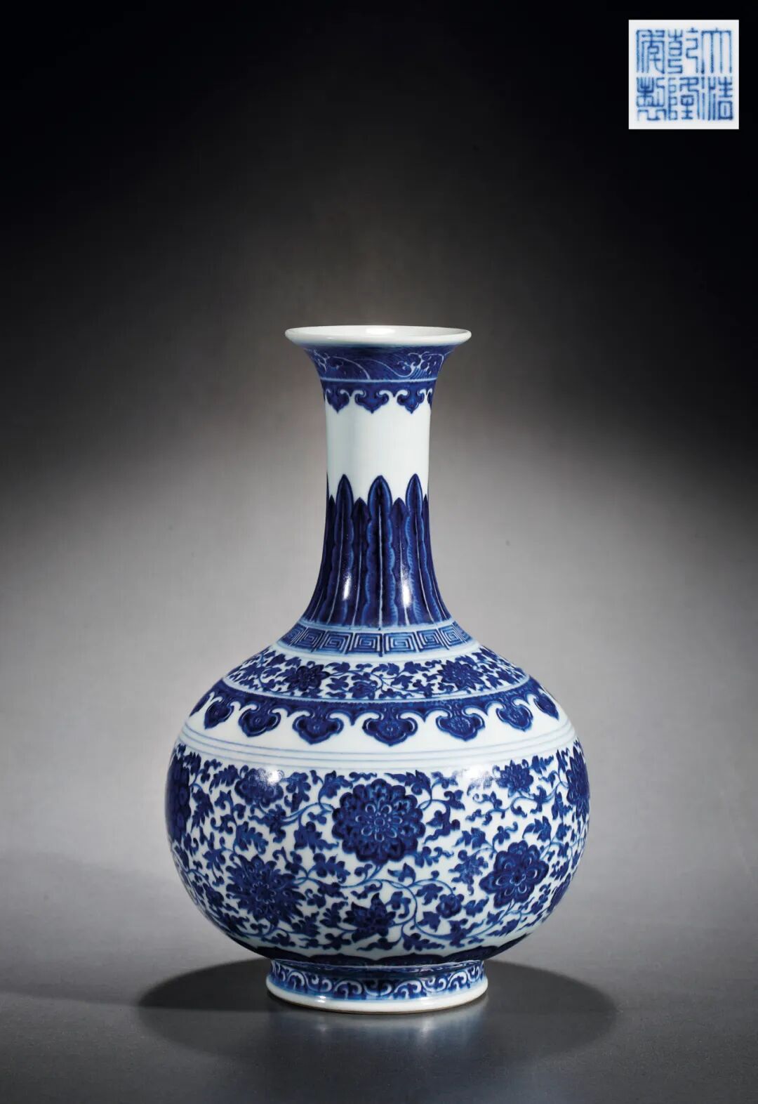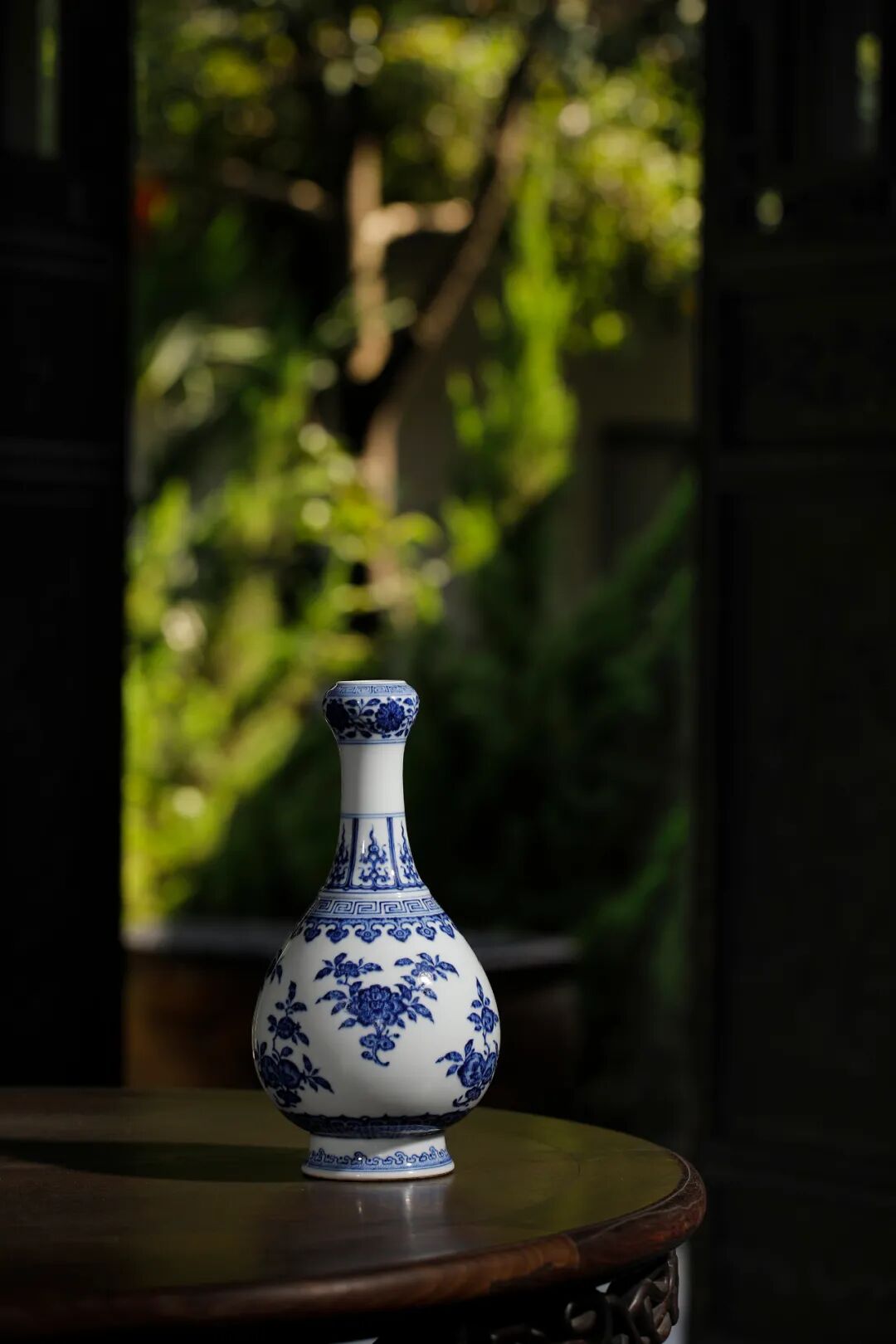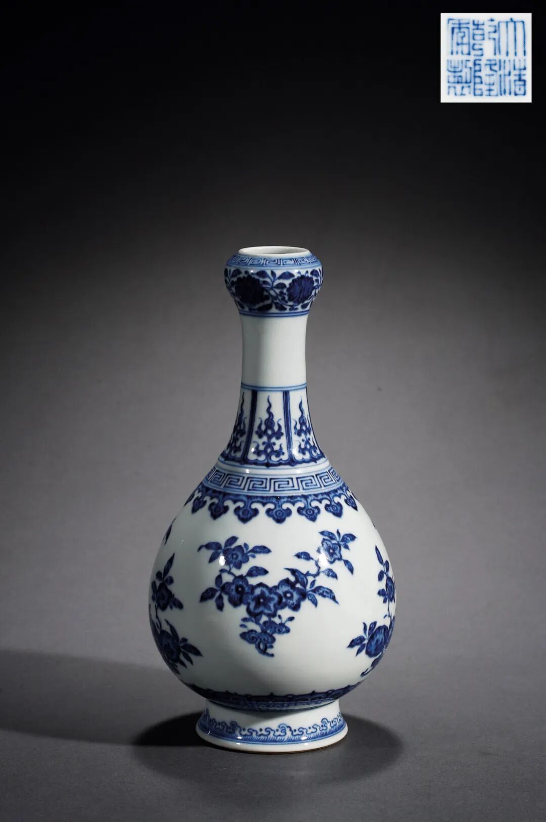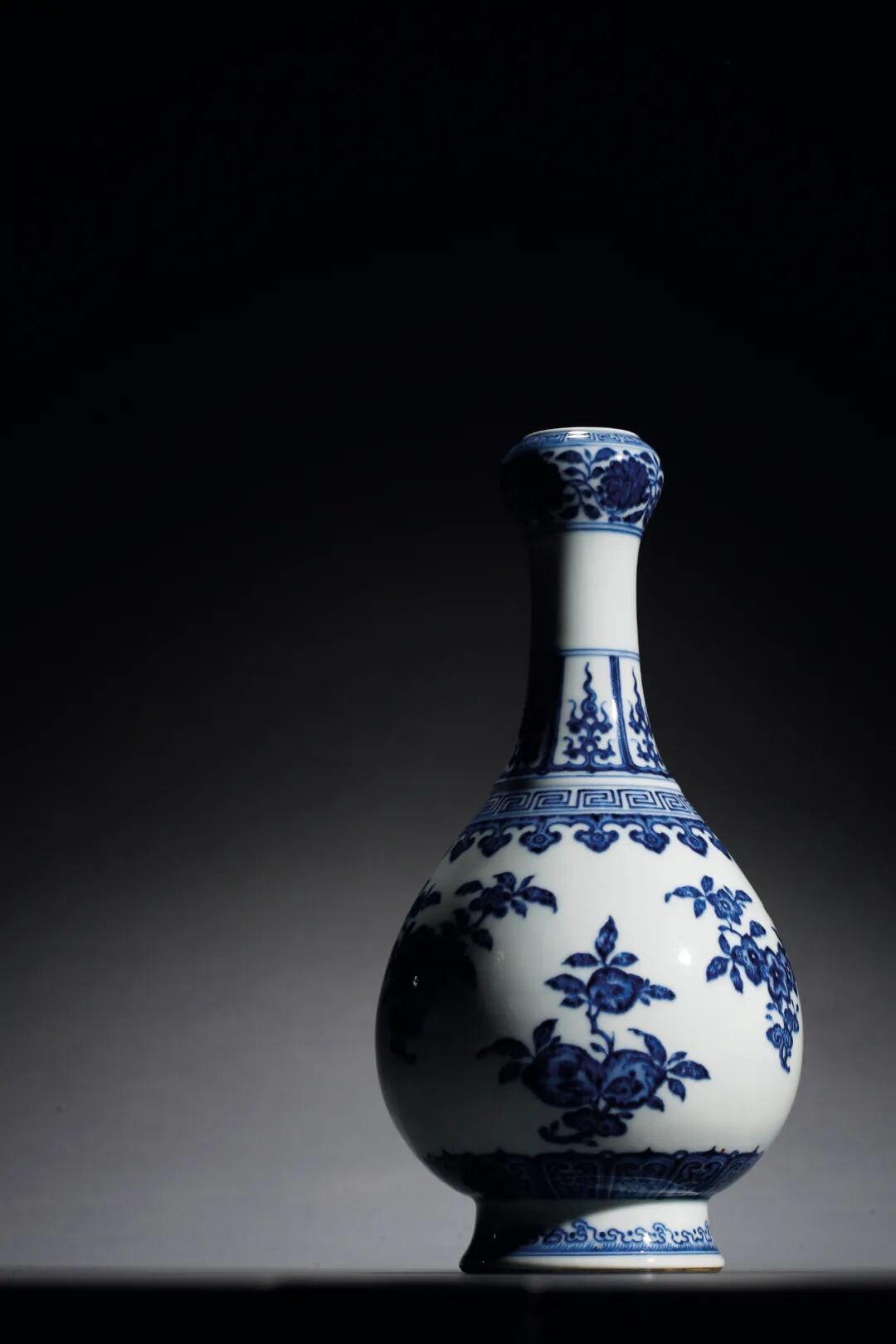 蒜头瓶因瓶口形似蒜头而得名,此件长颈微束,溜肩鼓腹,高圈足略外撇,全器师法古器,青花色点染之法为仿永宣青花铁锈斑式样,为乾隆时期景德镇御窑厂精品之作。