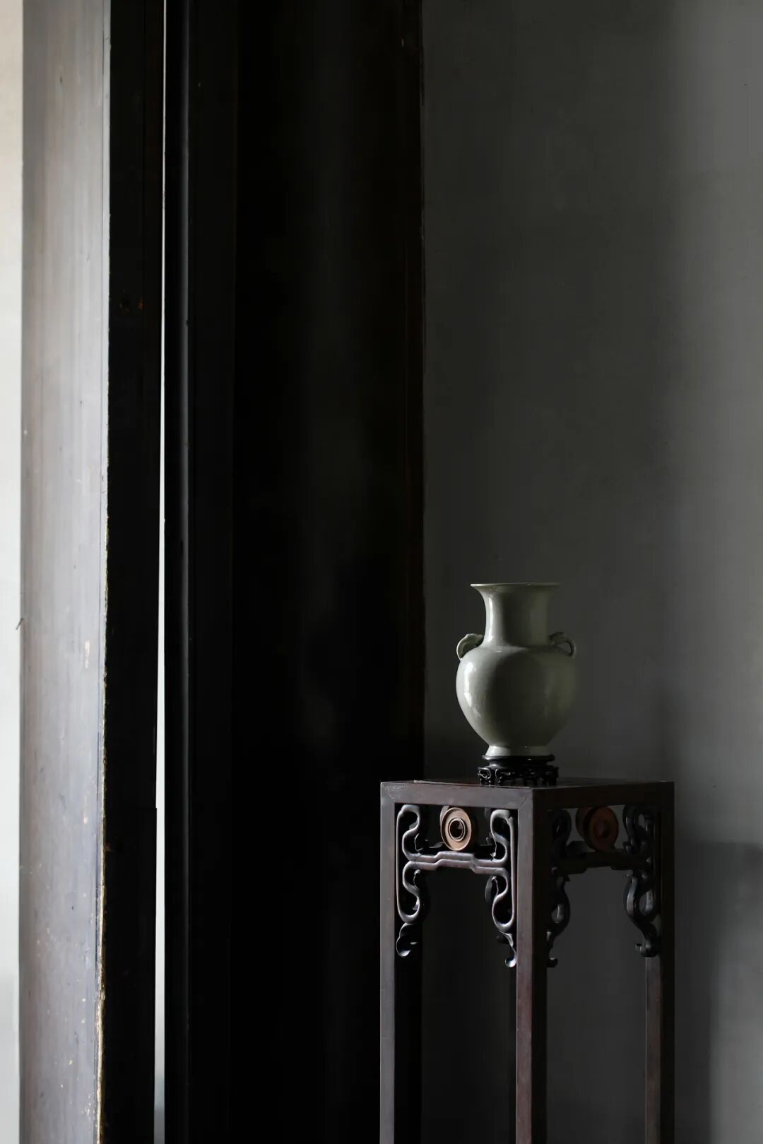 流畅的造型与静穆的釉色,全器似茶叶细末遍洒其中。瓶底足露胎呈黑褐色,胎釉相接处留有刮削时形成的小锯齿纹,以摹「铁足」之效果。