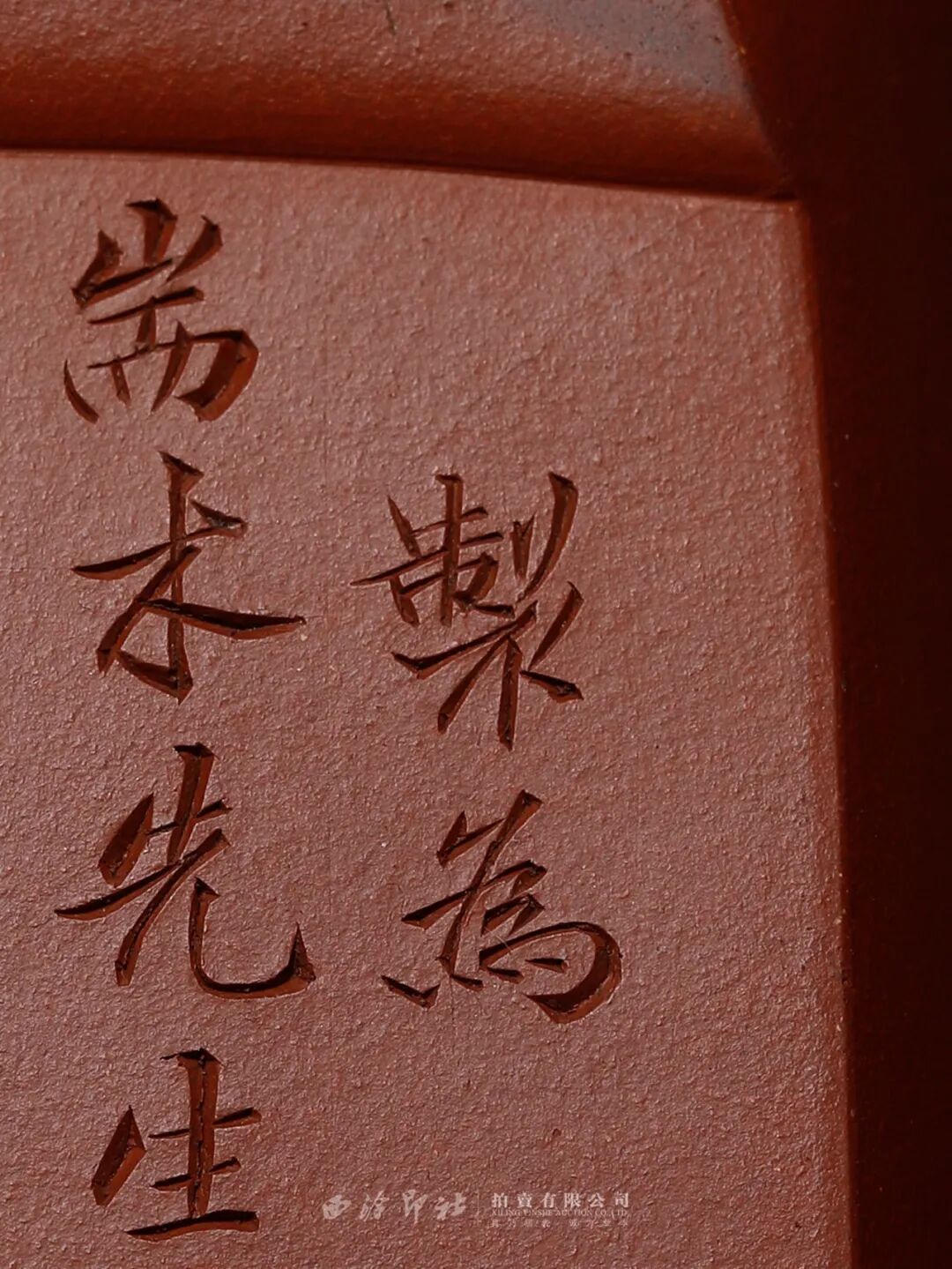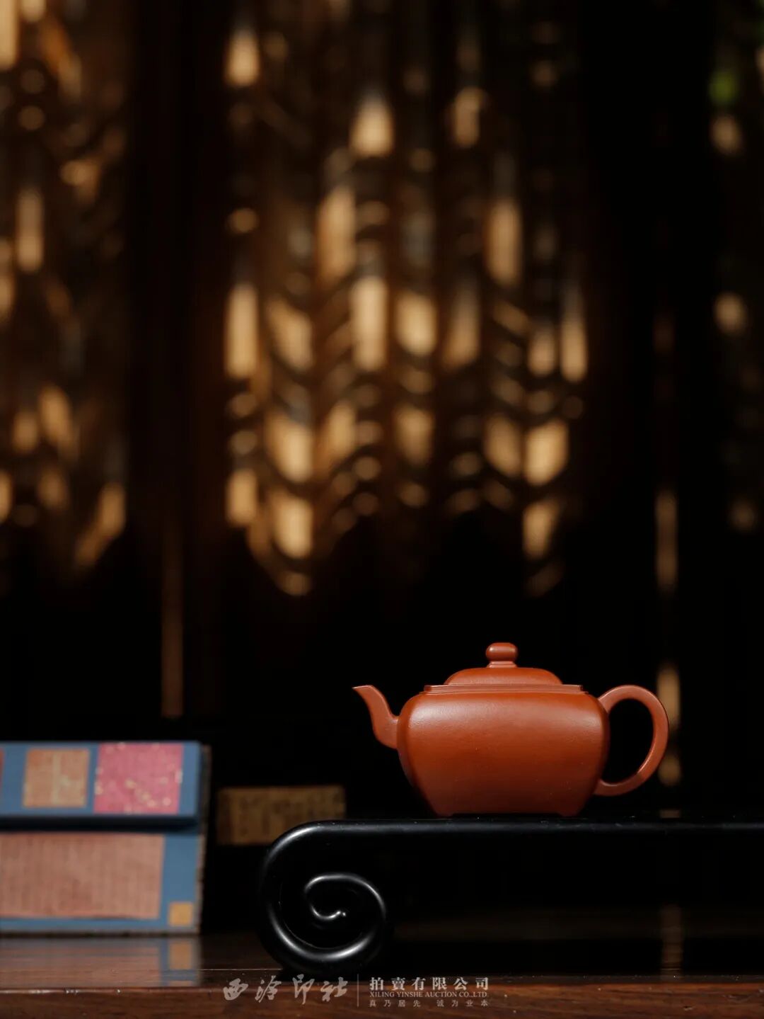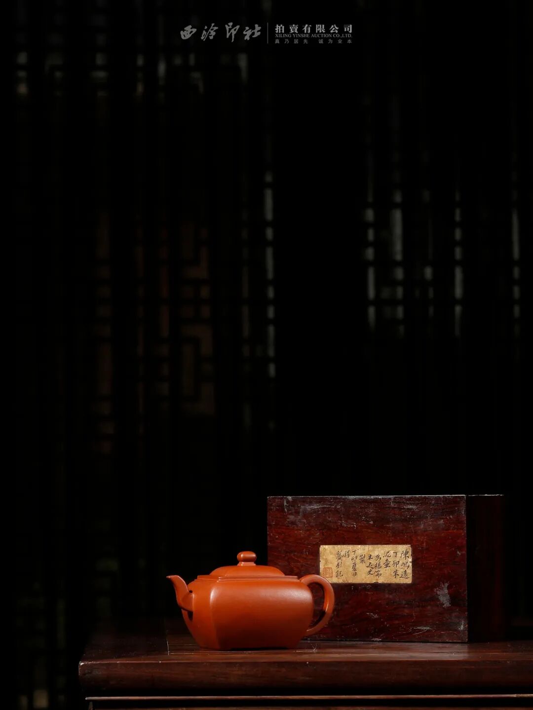 吳免牀《陽羡名陶錄》載曹希文(廉讓)以時壺易馬仲韓方氏核桃墨。馬詩有:“文枕挨玉鞭”之句。其時距少山、于魯尚未百年,已珍視如彼。陳鳴遠擅有清一代之絕技,當日文人學士爭相延攬,而與楊耑木交尤厚。康熙二十六年丁卯為耑木製此壺,後四年辛未,耑木傳臚入詞林,官右中允,此款為耑木所自書,晉唐風格,足繼米、趙,宜其名重海内。壺質為趙莊山之石骨,黄泥陶之變硃砂色者。兼用“陳鳴遠”、“壺隱”二印,尤為鶴峰經營滿意之作。中允卒于康熙之末,張芑堂《陽羡陶説》謂見此壺于朱笠亭師樊桐山房。蓋乾隆初年已由楊氏松喬堂歸于笠亭矣。同治間,吳清卿太史得而寶之,後乞道州何子貞太史之長公書其先德墓誌,奉壺為謝。民國元年壬子,公曾孫星叔愛趙某之龍文(玏),因互易焉。壺旋歸褚禮堂同年。復為上虞經滌廬所易,經有鹤壺精舍之築。又数年,有陳賈為介,售之日本長崎之瑞(玏)軒,星叔之玉,後於火車中被竊。嘗謂壺與(玏)皆俊物,然力不能兼有,而今皆不知所在,辄為悵惘。此壺余輾轉購得之,漢方勝形而作長式,無處不兼弧形,式略長而嘴微內向,直視仍為曲綫形。光澤鑑人,完好無缺,所鐫款句與名陶錄略有倒別,蓋芑堂于見壺後追錄之詞。不然,則上元一日詎能作兩壺者?製壺之年距今為五丁卯,甲子四周,蓋二百四十一年。東海歸來,足稱陶寶,為裝檀櫝,集松雪書四字旌之,並記其流傳之緒云。