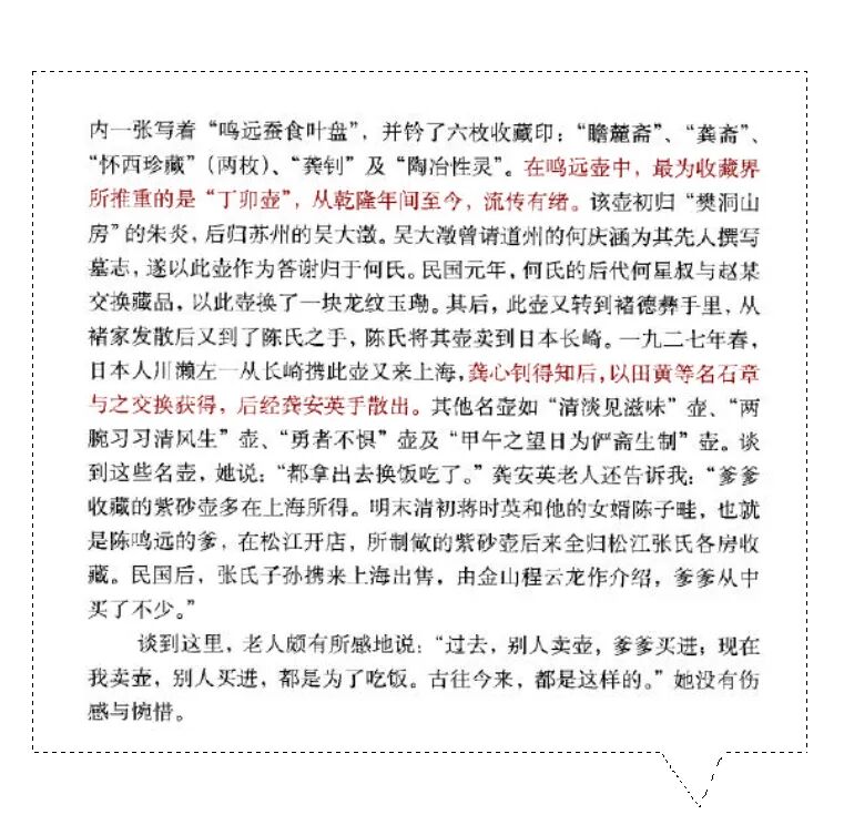 《文汇报》记者郑重于新千年初执笔编著《海上收藏世家》,遍访藏家或其后裔,广泛收集文献史料。鉴藏家龚心钊、龚安英父女一篇,取名为《珍惜那段情缘》。访谈时,龚心钊之女龚安英肯定地表示:在鸣远壶中,最为收藏界推重的是丁卯壶,从乾隆年间至今,流传有绪 【注2】。/