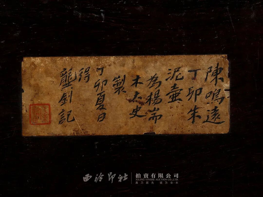 尽管丁卯年,自谦地刻了“壶隐”小印,但陈鸣远是有艺史留名的自我意识的。随着名声的确立,陈鸣远的文人朋友们频繁捉刀代笔,其中最著名的是曹廉让、杨耑木。自《阳羡陶说》始,《阳羡名陶录》《阳羡砂壶图考》至龚心钊所述,人们普遍认为,丁卯壶款“為耑木所自書,晉唐風格,足繼米、趙,宜其名重海内”。杨耑木当然可以在自己定制的壶上,落自己的款,表明是自己的笔迹。但他选择隐去自己,凸现壶的创作者为陈鸣远,一方面是二人交往至密,另一方面,可见鸣远壶当时名声之赫赫。丁卯壶作为陈鸣远声名盛起的代表,被著名的紫砂典籍载入。从稍晚于陈鸣远的文人张燕昌《阳羡陶说》开始,《 阳羡名陶录》《阳羡砂壶图考》等一切紫砂重要典籍均为此壶单辟笔墨。