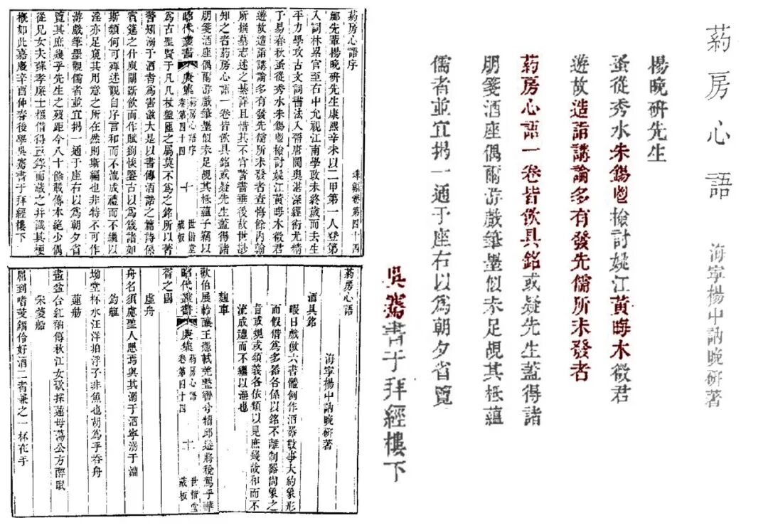我们发现,吴骞在编搜善本之余,费劲心思保存并出版了杨耑木的《药房心语》。这部书来自于杨耑木关于饮具铭文、酒座偶尔游戏的散纸笔墨。吴骞在序言中确定了杨氏的主张,强调饮具之铭可作为文人座右之铭,意味朝夕省览。