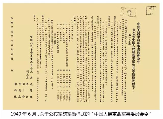 6月15日,新政治协商会议筹备委员会开幕当日,中国人民革命军事委员会主席毛泽东、副主席朱德、刘少奇、周恩来、彭德怀发布《中国人民革命军事委员会命令》,正式公布中国人民解放军军旗及军徽样式:“中国人民解放军军旗为红地,上缀金黄色的五角星及‘八一’两字,表示中国人民解放军自一九二七年八月南昌起义诞生以来,经过长期奋斗,正以其灿烂的星光,普照全国。……中国人民解放军军徽为镶有金黄色边之五角红星,中嵌金黄色‘八一’两字。”
