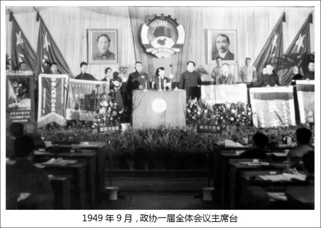 1949年9月21日至30日,中国人民政治协商会议第一次全体会议在北平中南海怀仁堂举行。因为中华人民共和国国旗在会议最后一天正式亮相,主席台上始终悬挂着4面八一军旗。军旗命令条文中本无“旗顶穗”的规定,但6月15日公布命令的报刊上,军旗已配有“旗顶穗”,虽然图片是黑白的,还是可以辨别其色彩为红色。政协主席台图片是红色“旗顶穗”的应用实证。