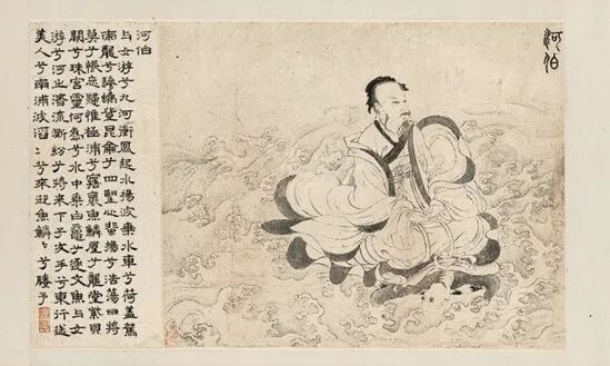 河伯是水神,骑于海龟之上,衣服帽带飞扬,波涛奔涌,乘风破浪。