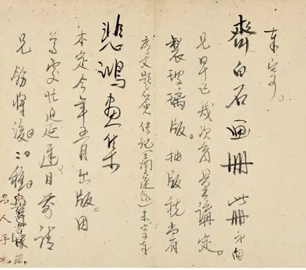 从内容看,涉及出版《悲鸿画集》等作品集,并推荐出版《齐白石画集》等,都是关系到美术史的大事。这些带有写信人和收信人温度的纸张、文字,真实记录了“大人物”们的生活日常,所思所想,书写着一地之境,一时之事,一人之情,未必面面俱到,却足够真实,透露出不少鲜为人知的小细节。