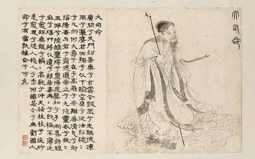 少司命左手执笔,右手握卷,慈眉善目,飘浮于祥云之上。左一童子正听其嘱咐。符合少司命主生,亲切、爱人、令人爱戴的特点。