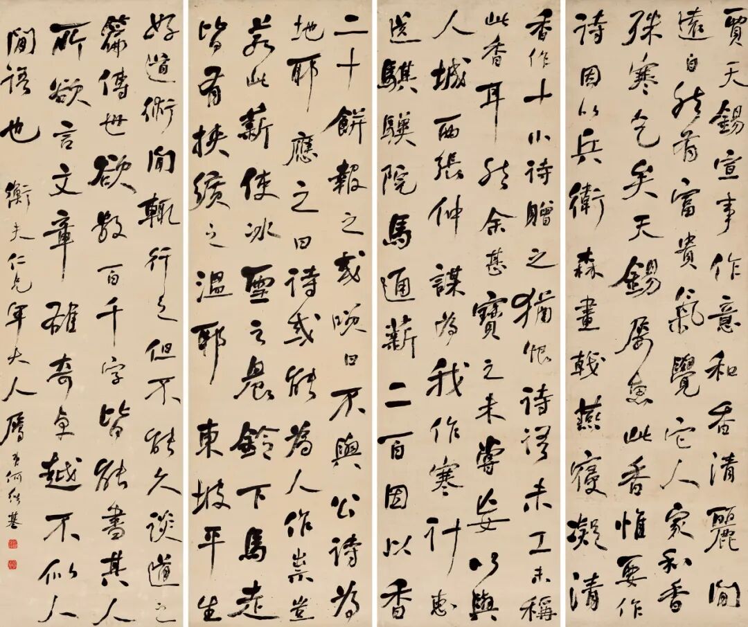 当然何绍基未必会在意这个名头,毕竟无论是书法创作成就还是对后世的影响,他都是清代第一人。何绍基的传统功底非常深厚,以颜书为根基,后来逐渐有了自己的风格,就像这件《行书录黄庭坚跋语四屏》行楷中夹带篆隶意味,凝炼中露出锐利,沉稳处带点俏皮,洋洋洒洒,一气呵成,洒脱自如而绝不苟且。正是他精力旺盛,书学大成之时的极精之作。