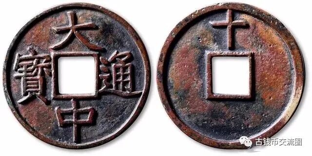 大中通宝是朱元璋称帝之前所铸的。龙凤七年,即元至正二十一年(1361),朱元璋设置应天府宝源局,开铸 “大中通宝”钱币。该钱颁行五等钱制,即小平、折二、折三、折五、折十共五等,形制大小与元朝至正通宝大致相当。光背计值钱折五以下均无背文,折十钱面值最高,在钱背上铸有“十”字。