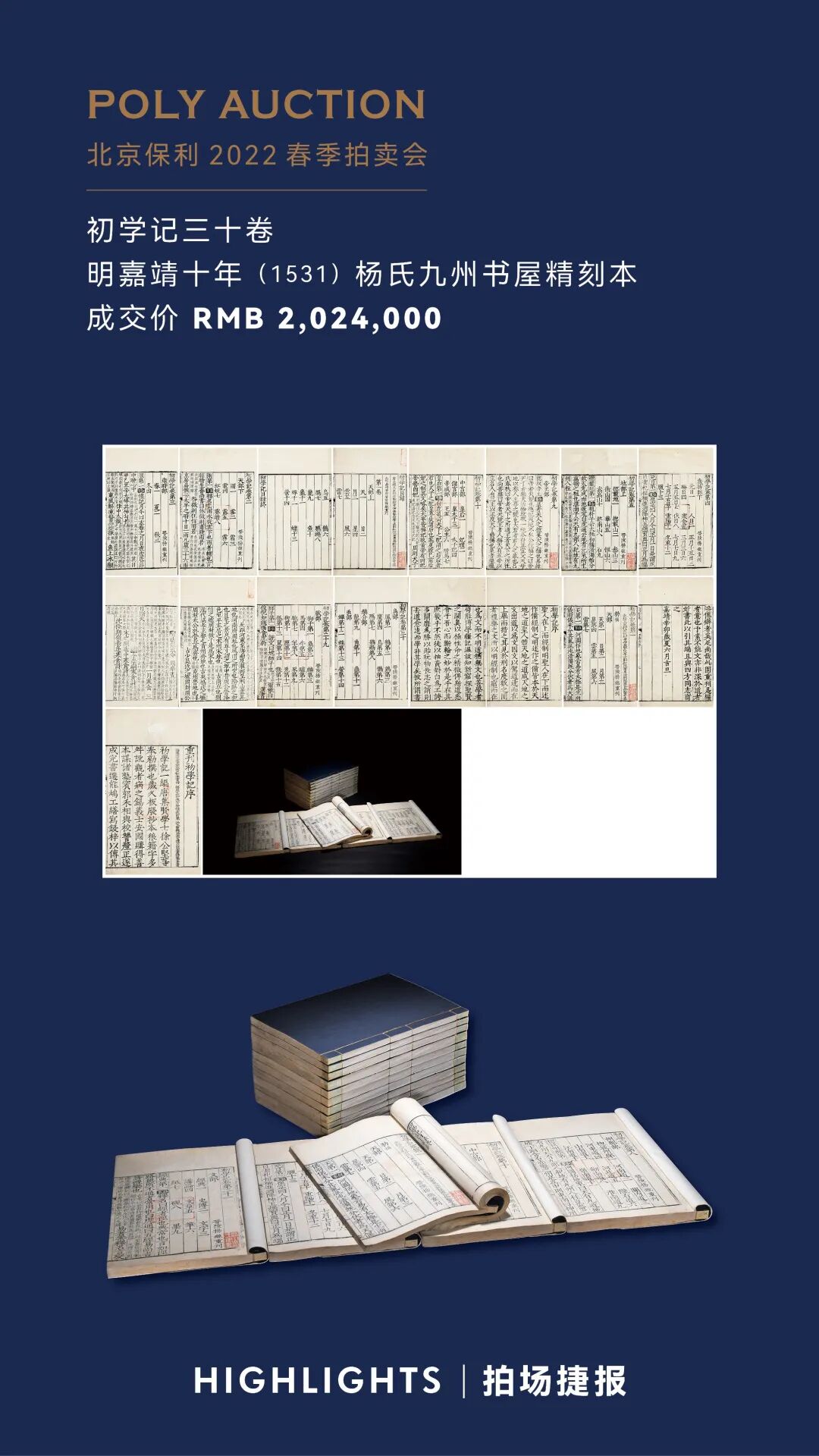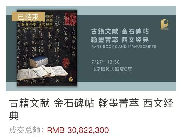 本场“仰之弥高——中国古代书画夜场”甄选34件古代书画精品,总成交额2.14亿元,诞生6件千万级作品,成交率达94.1%。在拍场中,第一个高潮来自寓意极佳的伊秉绶《长生长乐之居》,在历经40分钟的加价拉锯中,最终以2875万元顺利成交,同时刷新了伊秉绶作品拍卖最高价纪录。初现拍场、清宫旧藏、著录累累的唐寅《晚翠图》卷以4082.5万元领衔全场;原是上海博物馆退还作品祝允明《五云裘歌》卷最终以2350万元落槌,加佣金2702.5万元成交;引发学术市场关注的明星拍品《万花春睡》则以2300万元顺利成交;戴震名篇《序剑》的原作母本——丁观鹏、张宗苍合绘《检书看剑图》最终以1748万元成交;长逾三米的绫本长卷、王铎为友人霍达作长诗《鲁斋歌》以1403万元成交;清代宫廷画家冷枚《虎子图》以及鲜于去衿存世极罕的书法真迹之一《困学斋诗册》分别以920万顺利成交;约在百年前散佚、如今合璧的石涛《山水小景册》以759万成交;吴湖帆旧藏董其昌《戏鸿堂摹古法帖第六卷》则以575万元成交。从本场的成交结果来看,可以窥见市场在逐步恢复的同时,其注意力仍集中在首现拍场的作品,以及脉络清晰、学术背景深厚的作品上。“艺林藻鉴——中国古代书画”涵盖242件拍品,总成交额4736.97万元。其中,预展期间便备受关注的乾隆帝《御笔临书卷》以8万元起拍,第一口叫价200万,现场气氛热烈,最终931.5万元顺利成交,高居本场榜首,超出估价百倍之多。贵介风流、雅人深致的孙克弘《著色盆景花卉卷》以258.75万元成交;《婴戏图》则以无底价起拍,经现场及电话委托多轮竞价,最终以126.5万元成交;姑熟画派创始人萧云从《寒峰樾馆图》以103.5万元顺利成交;封面作品夏芷《携琴访友图》则以101.2万元顺利成交。本场“艺林藻鉴——中国古代书画”拍品数量和质量经过优化及调整,专场表现较为优异,从藏家反馈和成交结果可以看出起到了非常积极的作用。本次“古籍文献金石碑帖翰墨菁萃西文经典”专场共计拍品411件,成交额达3082万元。其中首次亮相于排场并作为本场封面作品的北宋拓宋装怀仁集王羲之《圣教序》(莫文骅本),以1265万元的成交价成为了此次古籍的头号千万级别大咖,而同样作为本场碑帖精品的端方旧藏善本专题也以总成交额569.25万元的价格100%成交。本场的另外一件封面作品,也是首见于拍场的明嘉靖九州书屋初印本《初学记三十卷》也已202.4万元摘得全场第二成交额的拍品。本次古籍专场取得的佳绩再一次向广大藏友证明了好东西在好的平台必定能绽放出炫丽的光彩。