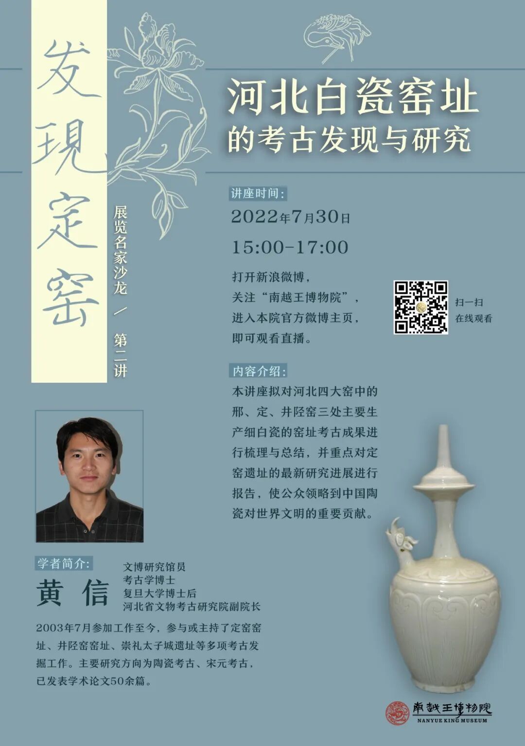 炎炎夏日,不如在家叹空调、看直播!这周六下午,又有一位大咖开讲了,“定窑名家沙龙”邀请到河北考古院黄信副院长为大家讲述“河北白瓷窑址的考古发现与研究”。7月30日下午15:00-17:00,诚邀各位观众在“南越王博物院”官方微博参与讲座,下面先为大家抢先剧透一波: