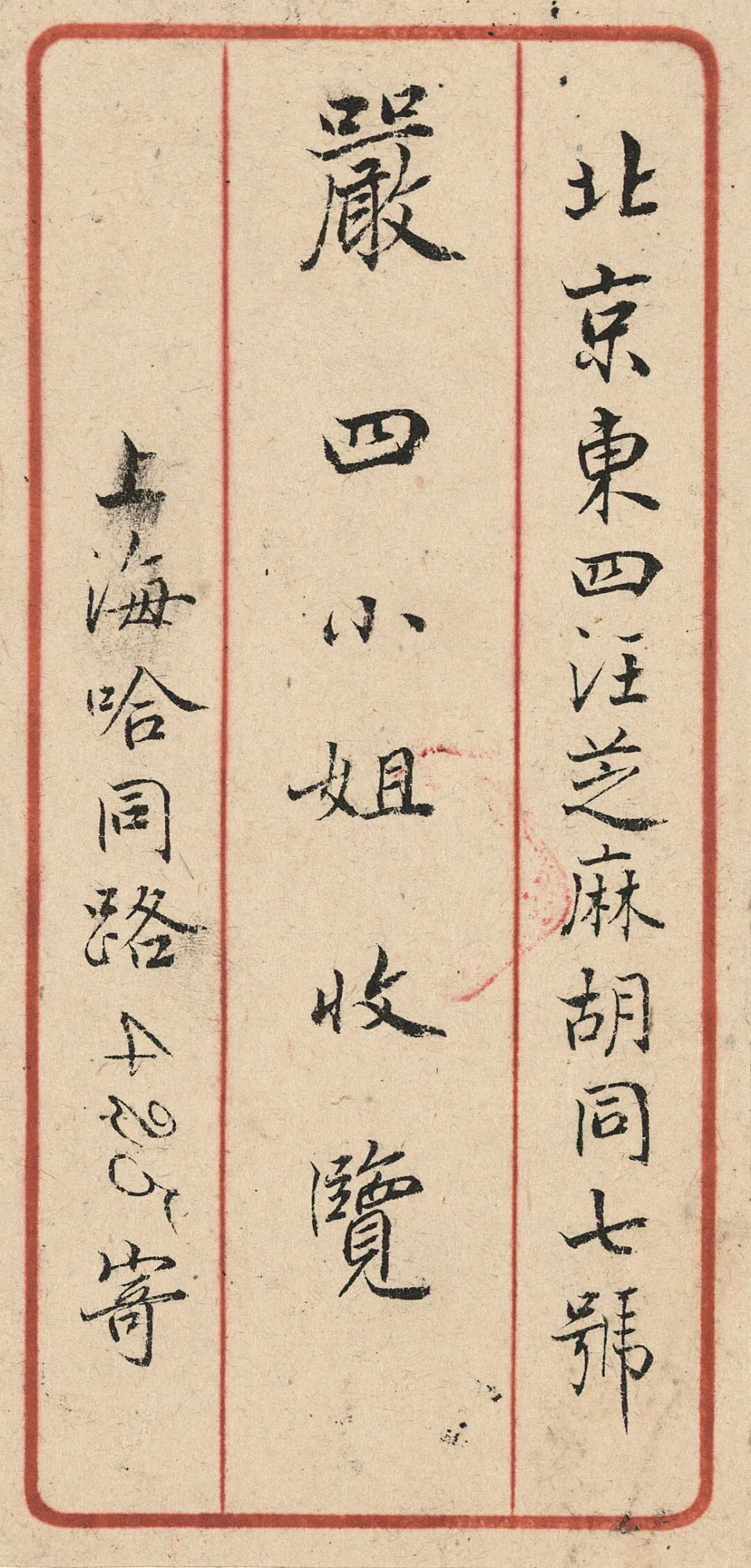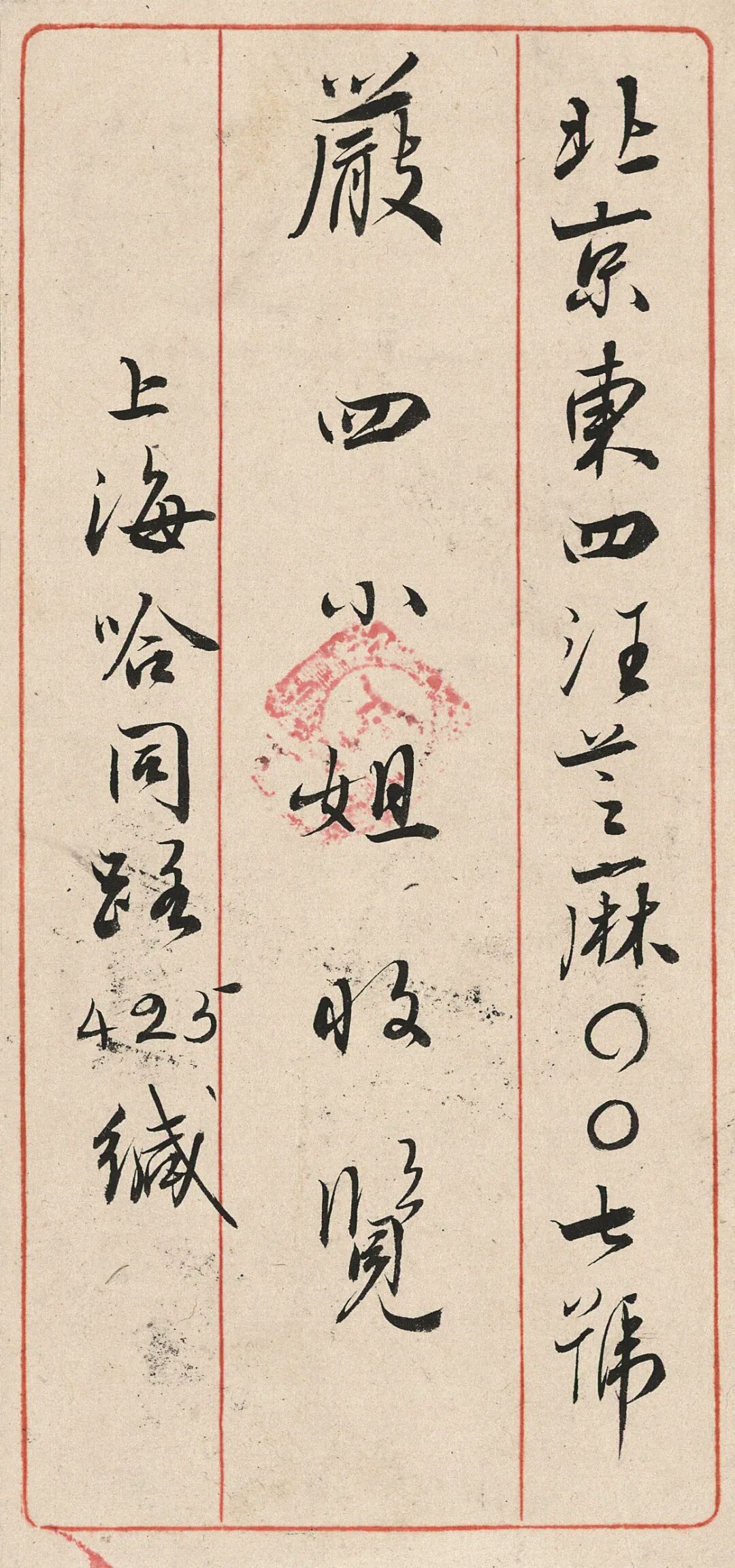 上款简介:严顼(1909~?),字眉男。严复四女。1921年严复逝世时,严顼仅十四岁,已通晓英、法两国语言,随后又自修德、俄、日各国文字。严顼后随母亲迁居上海,在沪期间研修药物化学,1949年以后长期在上海医学化验所工作,成为化验所的工作骨干。终身未嫁。