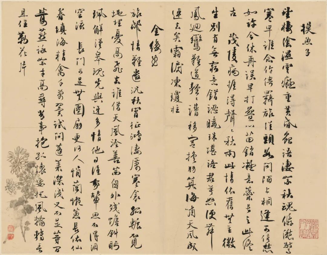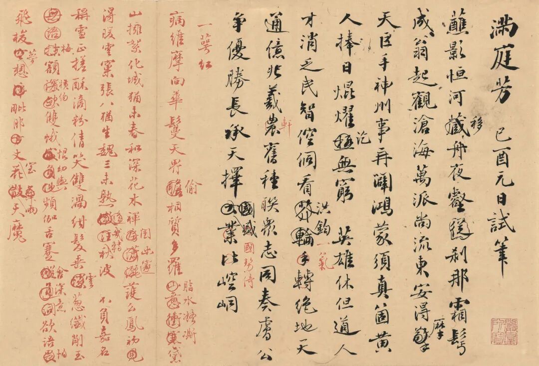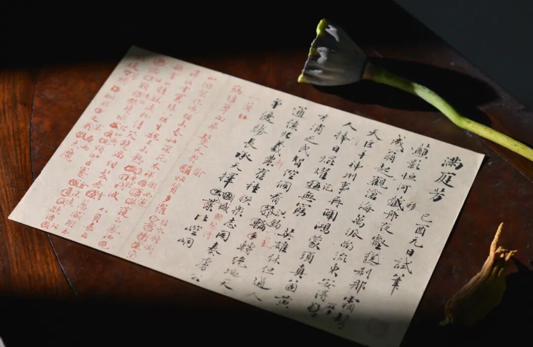 二词用墨、朱二色毛笔书就,多亲笔修改痕迹。如《满庭芳》词中有“大业比崆峒”后改“国盛比崆峒”又以红笔改为“国势倚崆峒”;《一萼红》“花散天魔”中“散”改“舞”又改“雨”等。