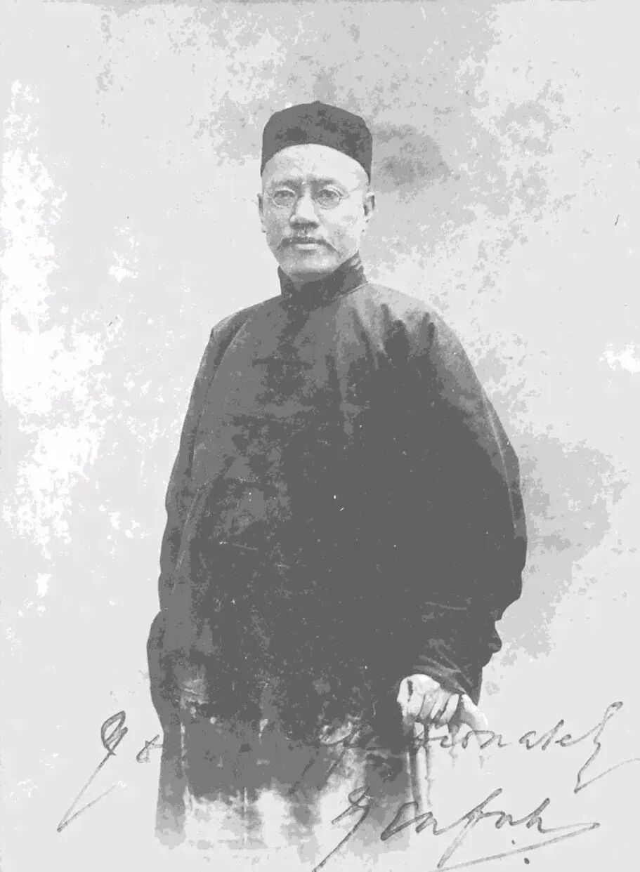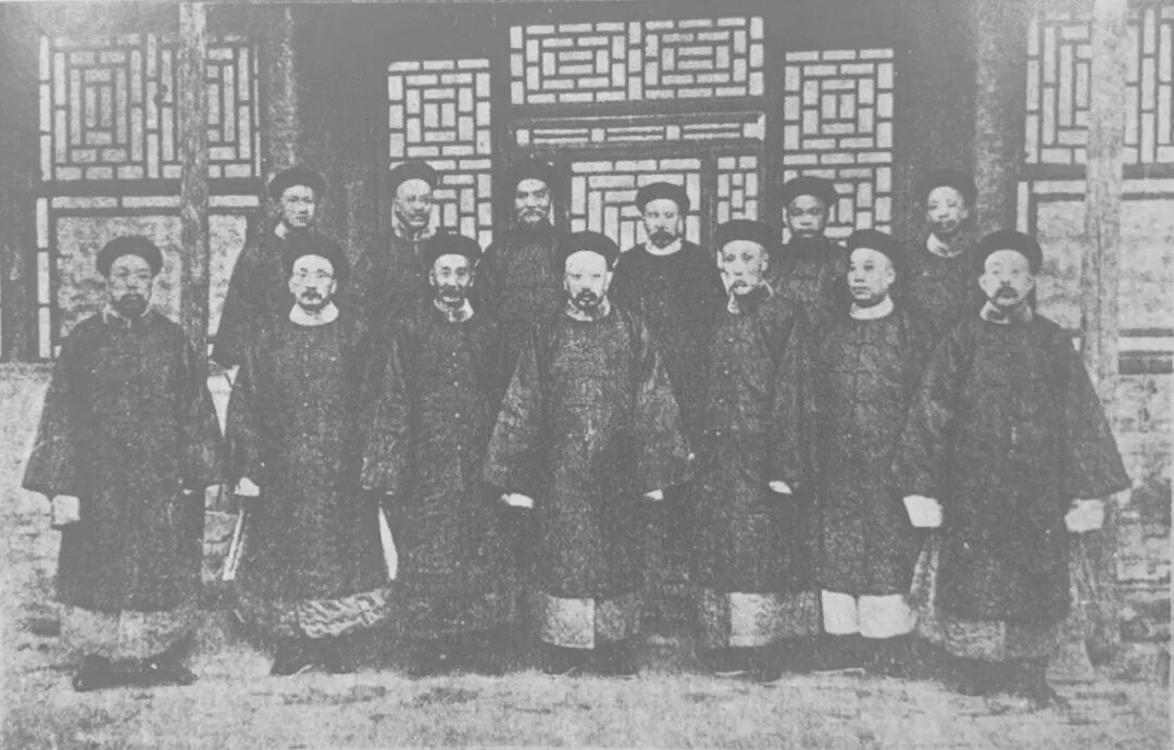 (同考官严复为后排左2,其他还有时任学部尚书的荣庆前排居中、考官唐绍仪居前排左2,同考官詹天佑居后排右2等人)