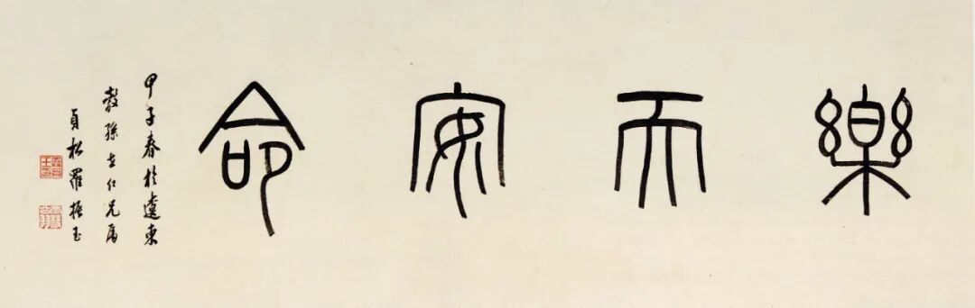 △罗振玉居住在旅顺时所写书法作品,落款爲辽东寓居。此时书风保持与居住在天津时相近,两地居住期间産生了大量罗振玉晩年著作和书法代表作。工作应酬之馀还有大量临写碑刻金文的书作,可见用功之勤,这类作品以临示五子罗福颐的爲至精至最,现藏旅顺博物馆。横幅篆体书作乐天安命,虽是应酬之作,然落笔坚毅,笔调与内容相契,透露出特殊岁月下的人生观。
