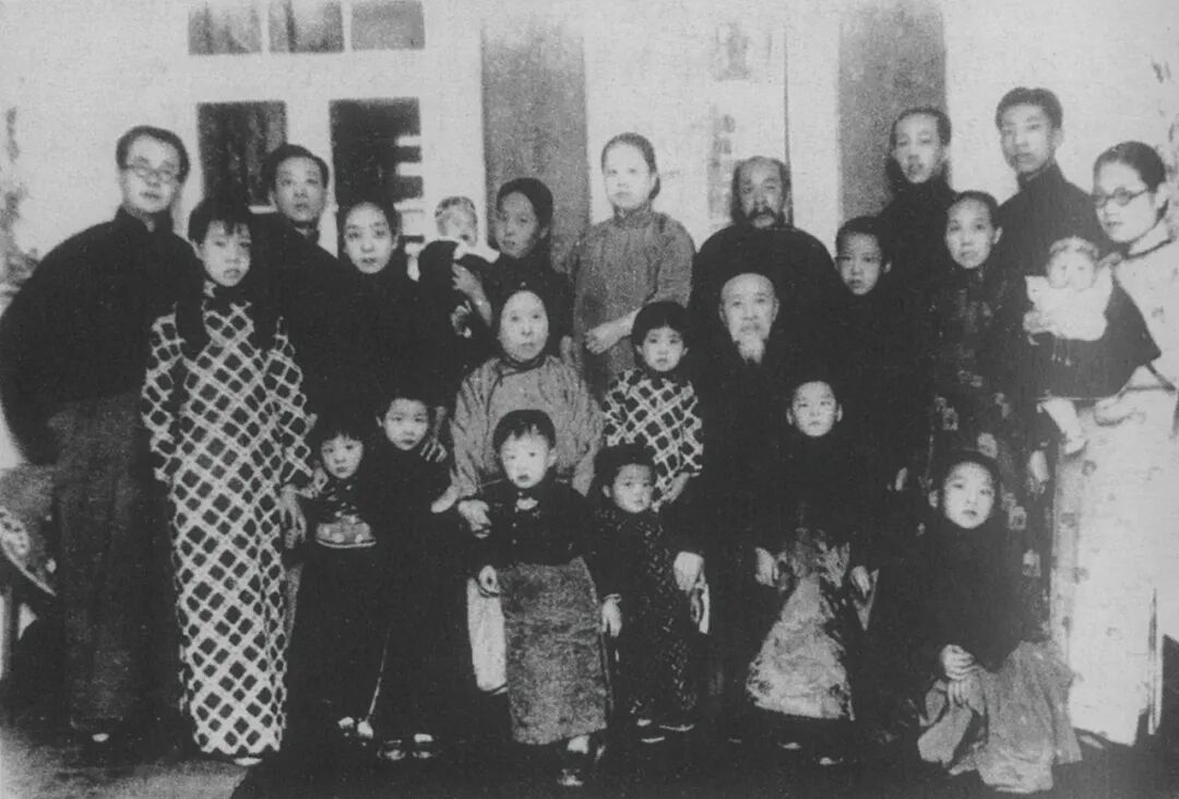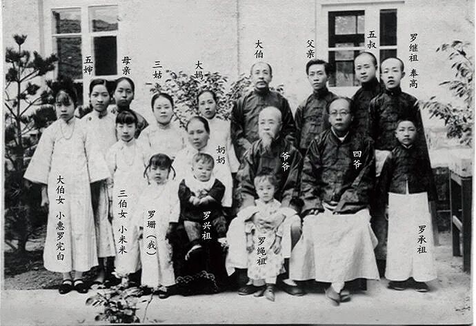 △一九三七年,罗振玉一家三代在旅顺罗公馆院内留影。老照片上有罗振玉三孙女罗珊标识家人姓名,是珍贵又准确的资料。
