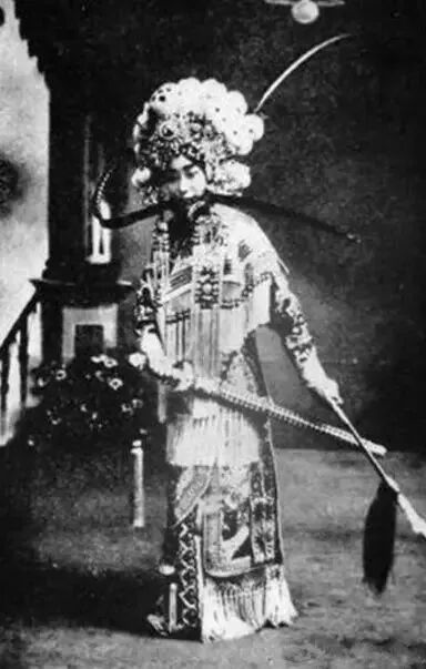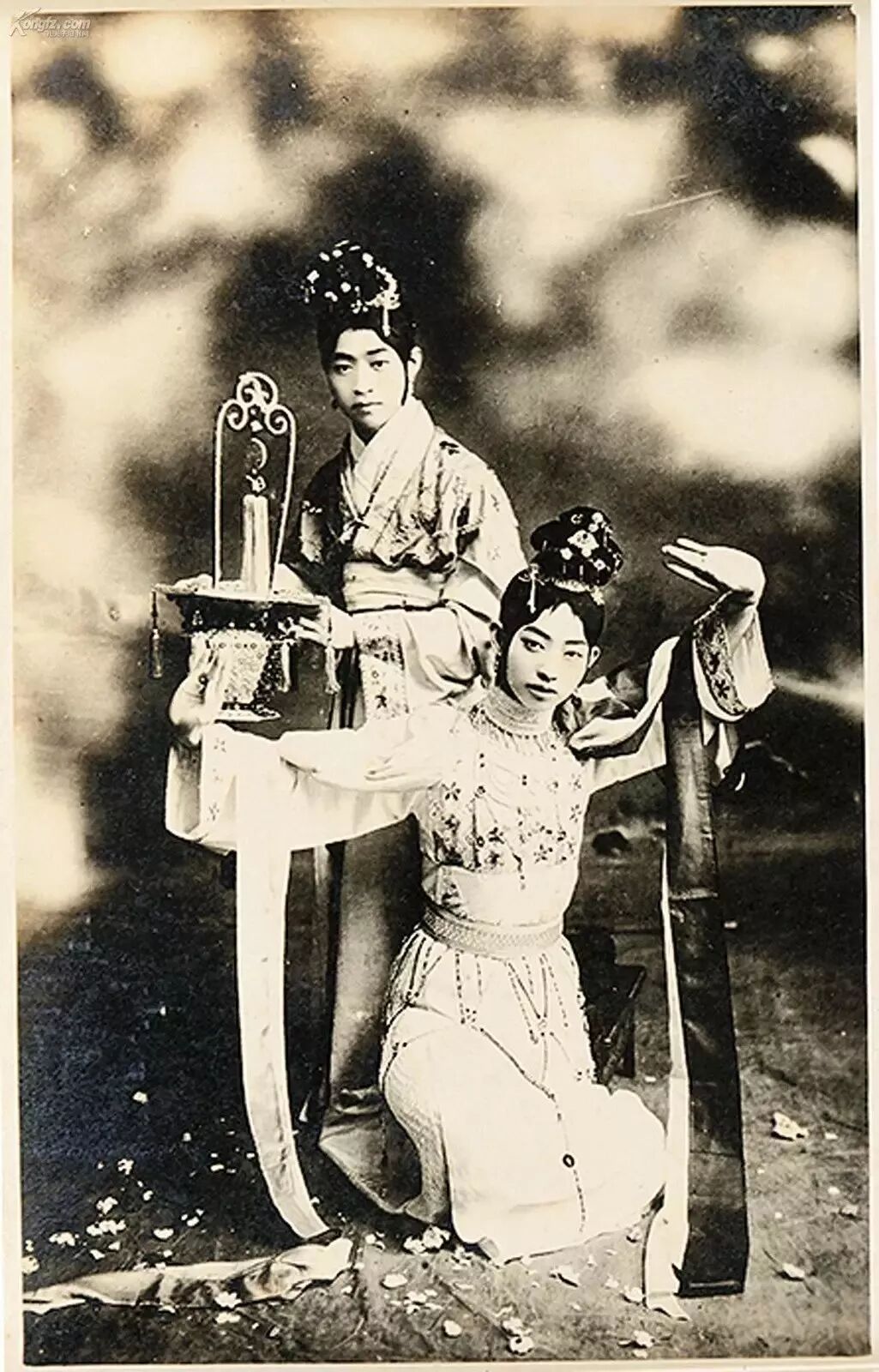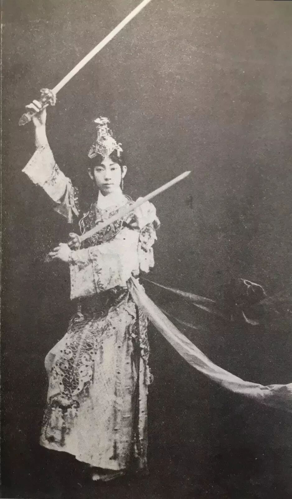 《霸王别姬》虞姬舞剑时亮相的那张照,从服装上看,系在腰间的长绸可以看出是照相时临时加的。一般是只《天女散花》的天女有绸带,是作为舞蹈的主要附件。虞姬手中舞双剑,如加绸带,则叠床架屋,成为累赘,所以在舞台上从来没有用过。
