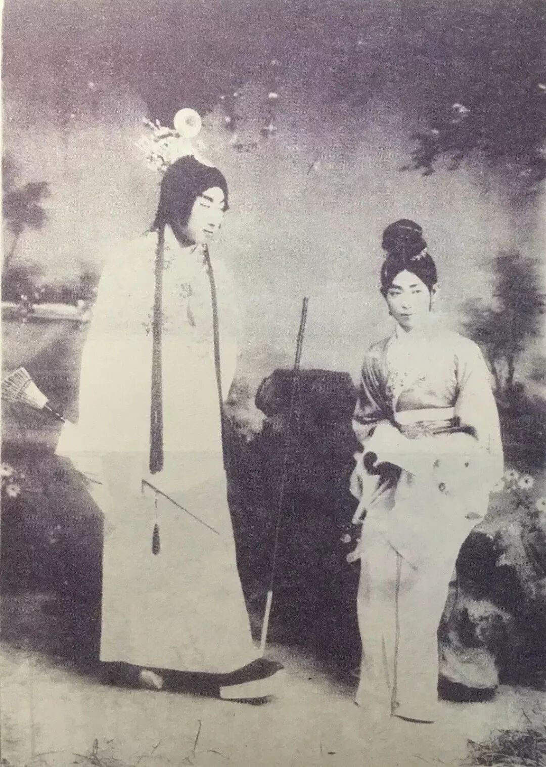 另外还有一张梅兰芳和姜妙香合演《黛玉葬花》的舞台剧照,梅兰芳扮黛玉,姜妙香扮宝玉。这是一九一六年一月在吉祥园初演京剧《黛玉葬花》后拍的。那时,梅先生二十二岁,姜先生比梅先生大六岁。