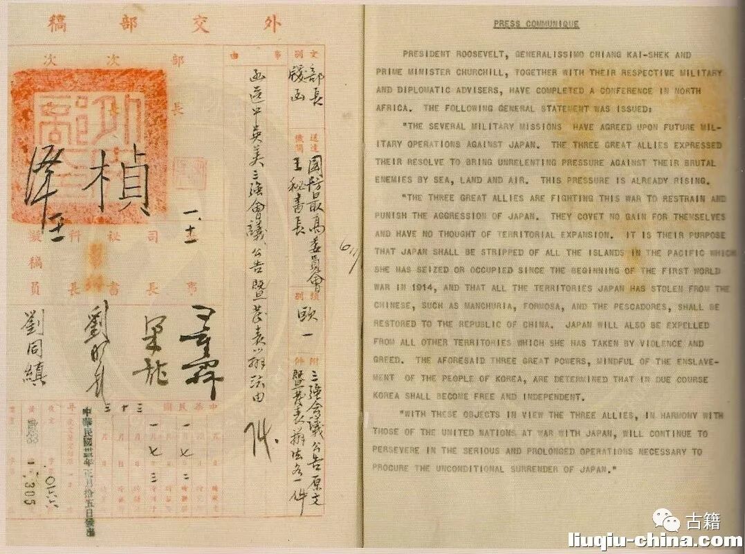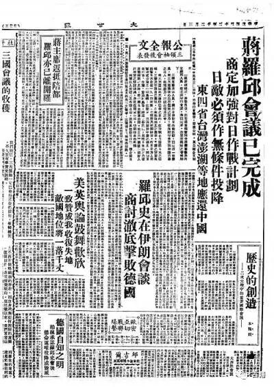 11月27日,蒋介石委员长与美国总统罗斯福、英国首相邱吉尔在开罗联合发表《对日作战之目的与决心之公报》,也就是通称的《开罗宣言》,明确宣示:“三国之宗旨,在剥夺日本自从一九一四年第一次世界大战开始后在太平洋上所夺得或占领之一切岛屿。在使日本所窃取于中国之领土,例如东北四省、台湾、澎湖群岛等,归还中华民国。”[20]12月3日,《开罗宣言》正式发表。
