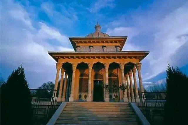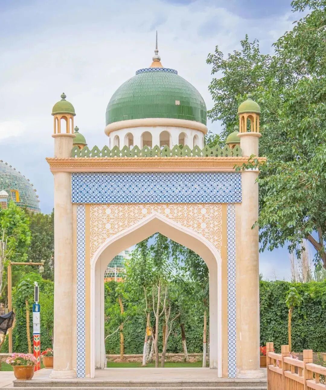 香妃园是一座大院,院内修建了门楼、小礼拜寺、大礼拜寺、教经堂和主墓室等建筑,建筑恢宏漂亮。这种绿色瓷砖、圆拱门窗的房屋非常特别,可以好好参观一下。主墓室是景区内的重点建筑,也是全疆较大的穹顶式建筑,穹顶旁还有漂亮的邦克楼。四楼一拱搭配上面铁柱高擎的五弯新月,造型和谐,使整个建筑物显得格外庄严峻拔。四周墙壁从上到下全都用深绿色琉璃砖贴面,上面绘有彩色图饰等。这些琉璃砖是300多年以前烧制的,时至今日依然光洁精美,可以好好参观一下。