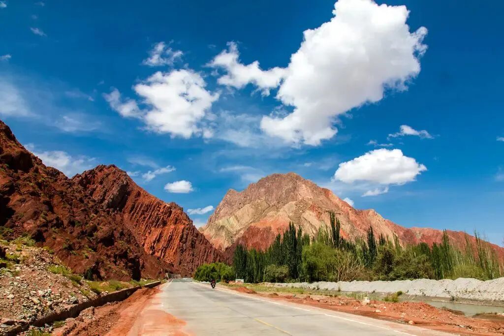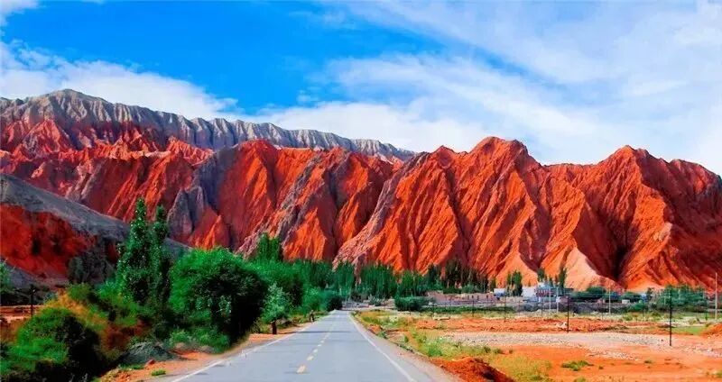 奥依塔克红山位于喀什河谷与帕米尔高原的交汇处,地质运动造就了这里比较独特的地貌,山体富含氧化铁等元素,呈现出深浅不一的红色,远观犹如跳动的火焰。奥依塔克是古突厥语,意思是群山之中的一片洼地。这里高山险峻,冰峰林立,大河滔滔,古木森森,莺飞蝶舞,芳草萎萎。