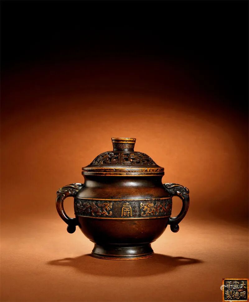 整器器型古雅,线条流畅优美,朴茂肃穆,古意盎然,富皇家气象,诚厅堂赏用佳器也。炉体方框内篆书“大明宣德年制”六字楷书款,为典型的清早期款识,铸后使刀精修,清晰利落,撇捺伸张,中宫内收,法度严谨,极具书法韵味,是为上佳之款。