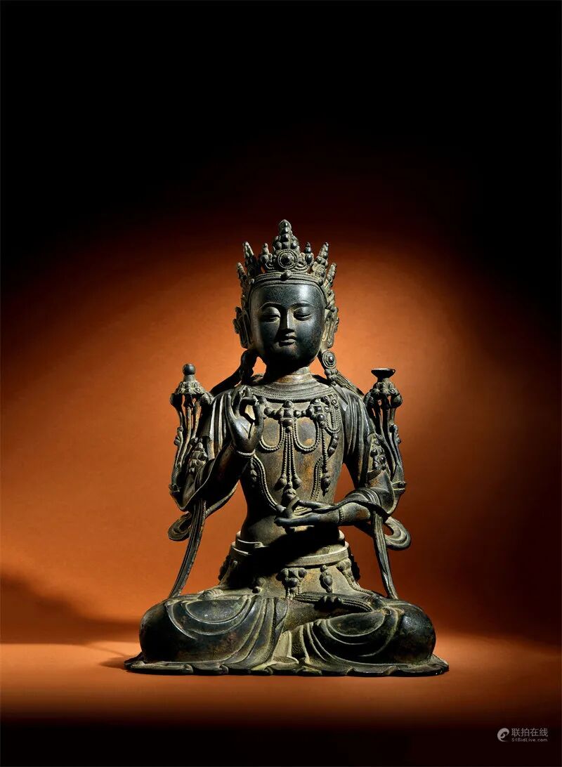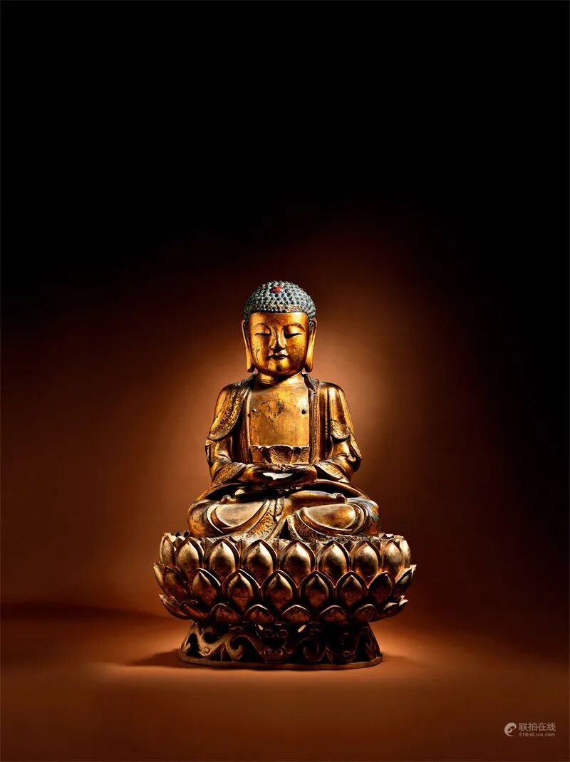 拍品估价:1,200,000 - 1,500,000 人民币1.北京保利,2011年6月5日,编号7296,“明·铜鎏金阿弥陀佛”,高度51cm,成交价RMB 3,680,000。2.北京荣宝,2018年12月3日,编号2871,“明嘉靖·铜鎏金释迦牟尼”,高度52cm,成交价RMB 4,025,000.3.中贸圣佳,2011年11月6日,编号2344,“明·铜鎏金阿弥陀佛”,含座高58cm,成交价RMB 2,300,000.这尊阿弥陀佛造像为标准的明代中原汉传佛教造像。造像双手结禅定印,结全跏趺坐。头饰螺发,肉髻显现,是宋元以来中原汉传佛教常见的装饰形式。面相方圆端庄,眼睑低垂,目光下敛,双目宛若未开敷的莲花苞,俯视着芸芸众生,神态慈祥柔和,典型的明代汉地造像面相特征。上身着双领式通肩大衣,下身着高束腰长裙,腰系束带并打结,这是中原造像典型的装束形式。衣纹采用内地传统写实性技法,简洁流畅,表现出衣料较强的质感。整尊造型端庄大方,比例舒展匀称,胎体厚重敦实,时代风格鲜明,是明代中晚期中原造像中的典型作品,并且体量颇大,漆金保存尚好,錾花精美,非常难得。