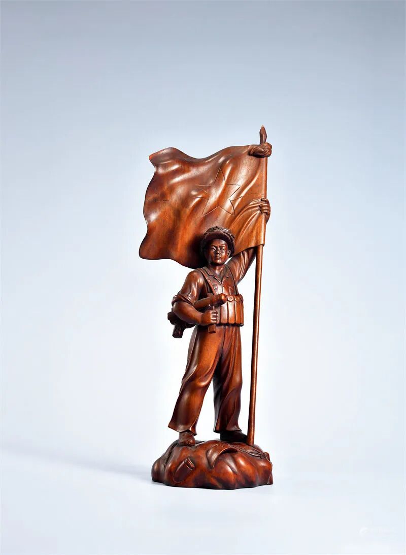 此像以龙眼木为材,圆雕手法表现解放军战士身姿挺拔,左手挎握冲锋枪,右手高举扶旗,大旗迎风飘动,脚下敌人盔甲散落,再配合神采奕奕的坚毅面容,令观者想见“抗美援朝”战役胜利的喜悦。